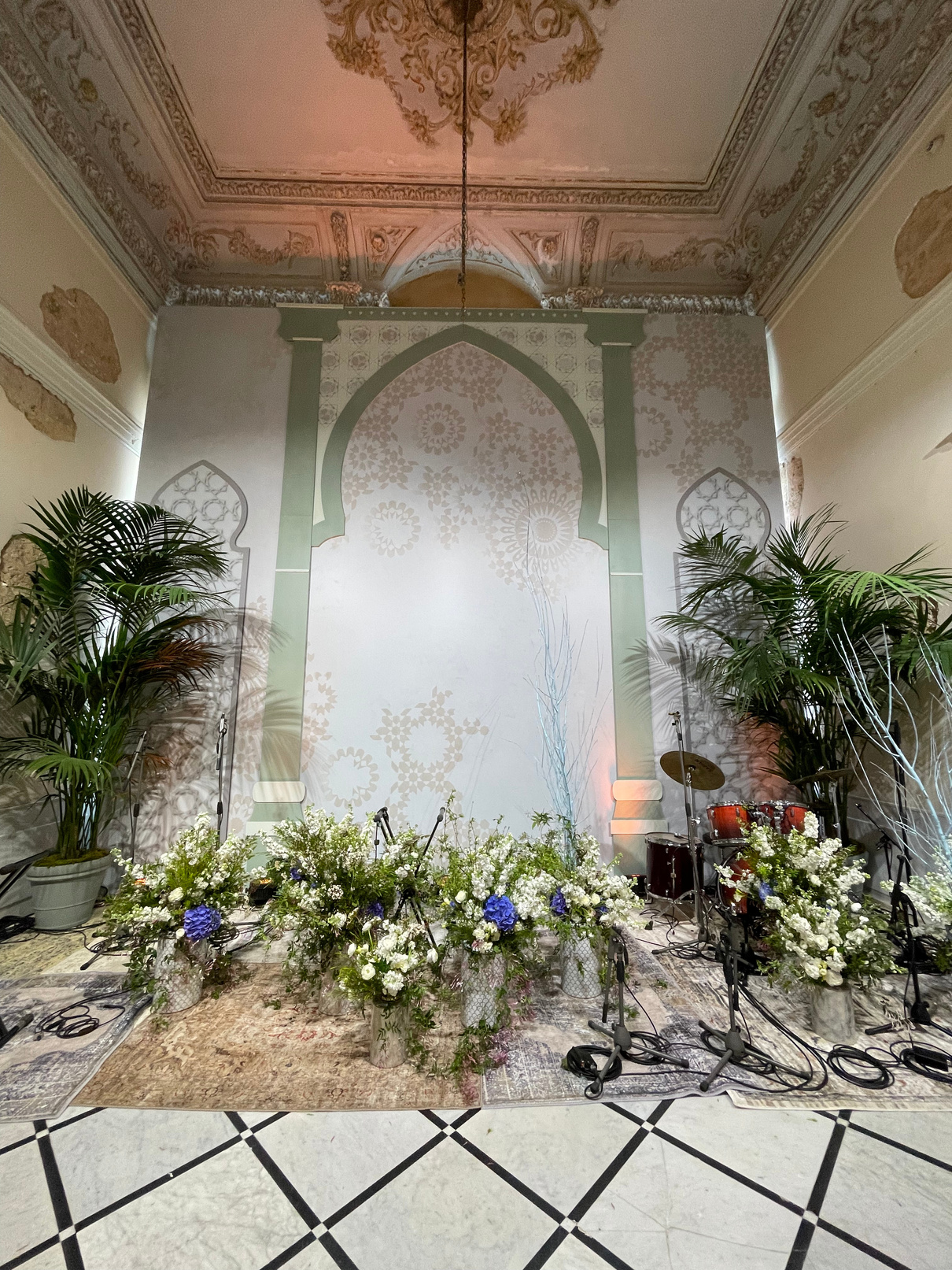 The entrance exuded a casino vibe, with a classic black printed catwalk and dance floor leading to a grand bridal staircase.