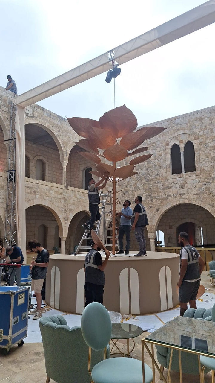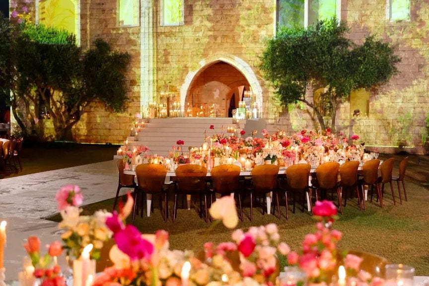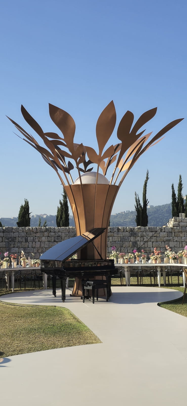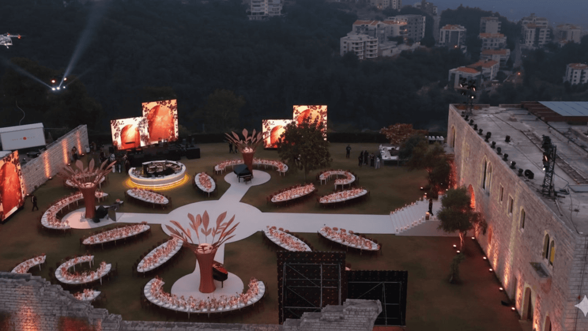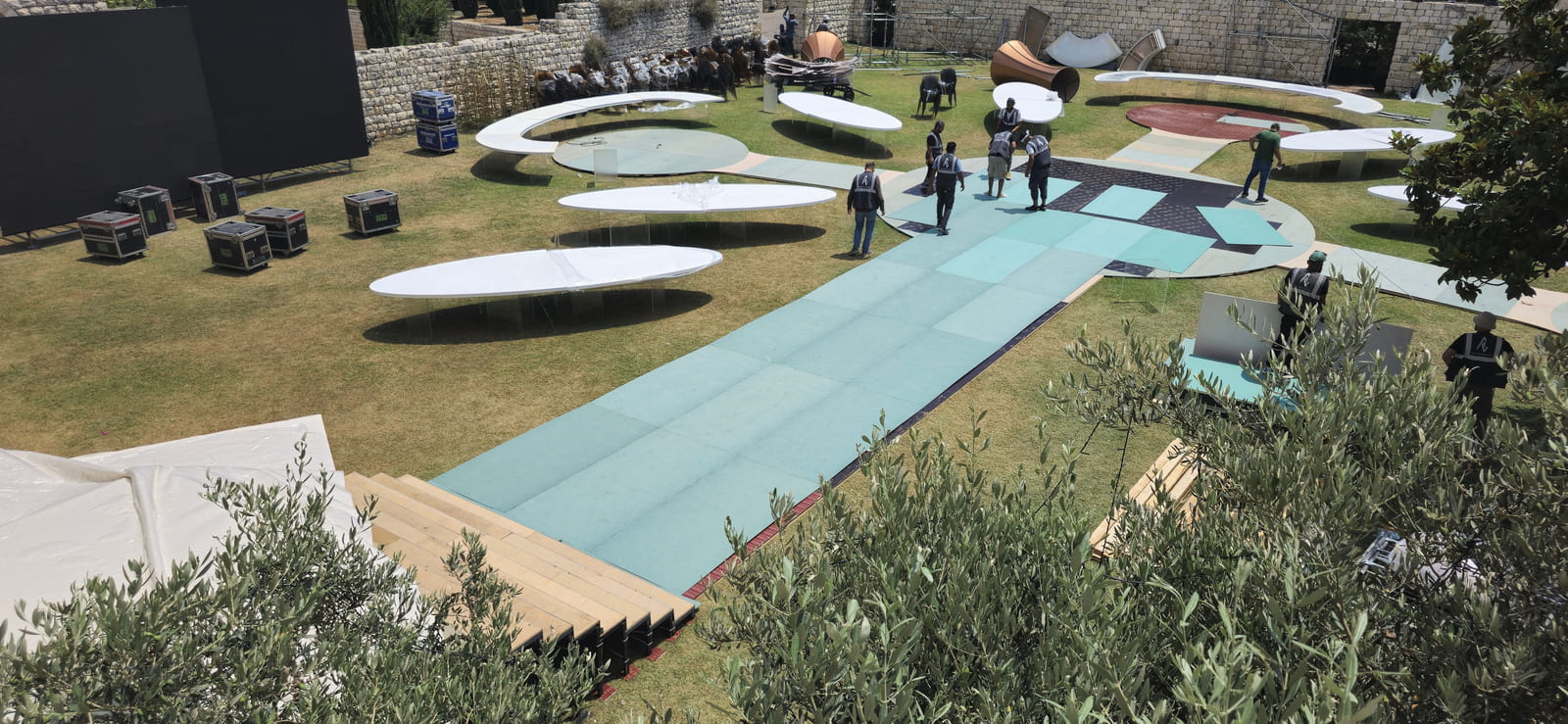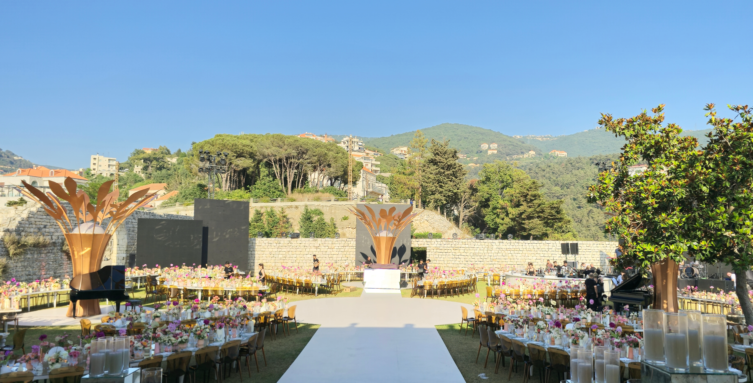A bespoke outdoor wedding where we built the full infrastructure, including the central dancefloor, flowing catwalks, sculptural tree installations, and a statement oversized chandelier suspended above the stage. The layout structured guest circulation and seating while blending contemporary elements with the venue’s historic architecture, creating a bold yet elegant celebration setting.