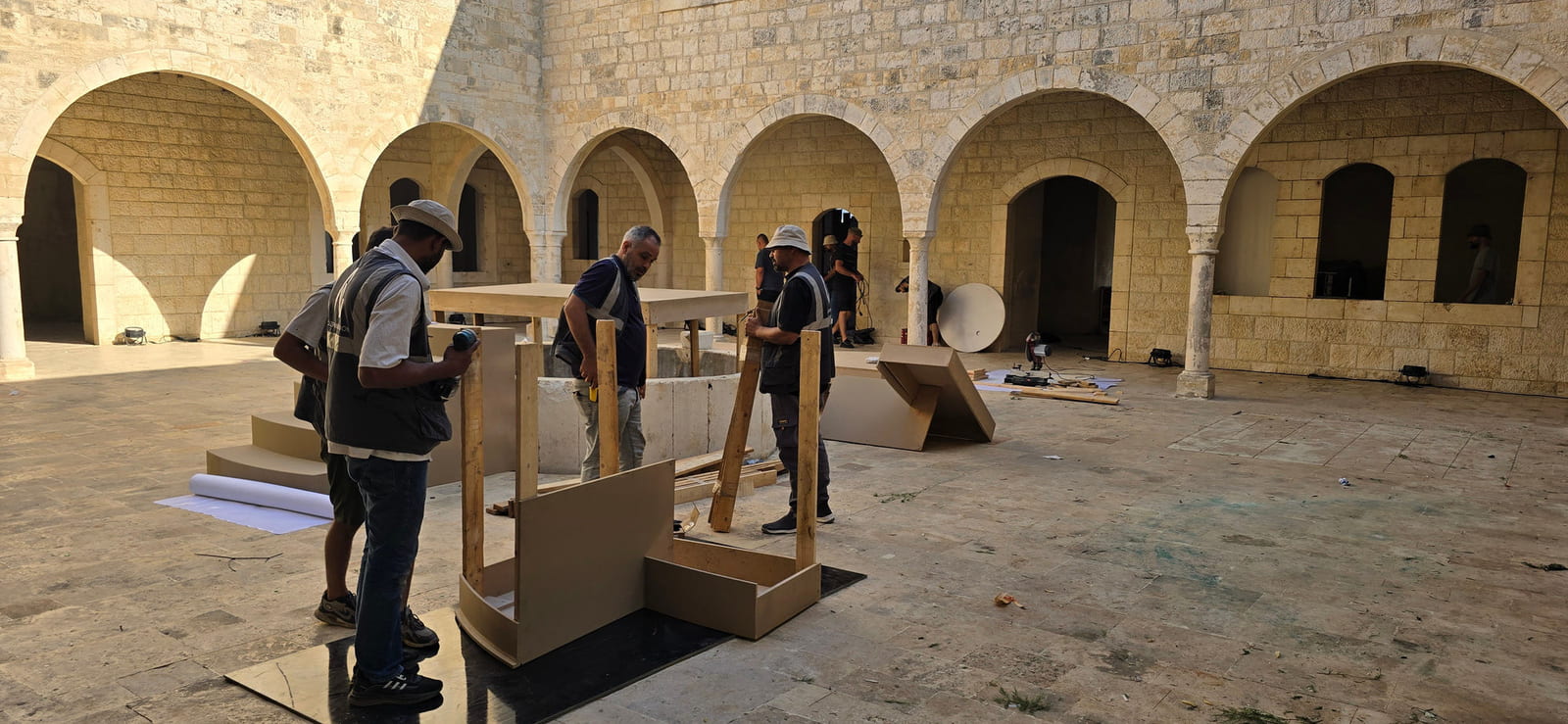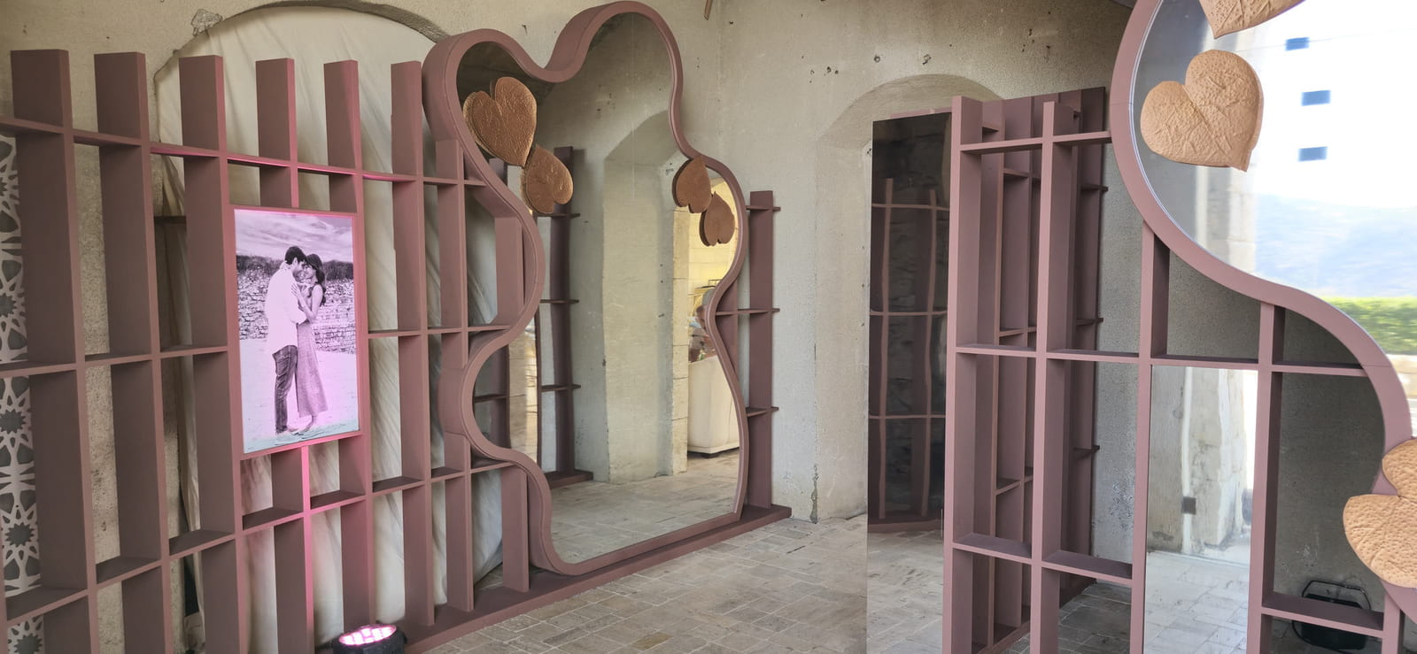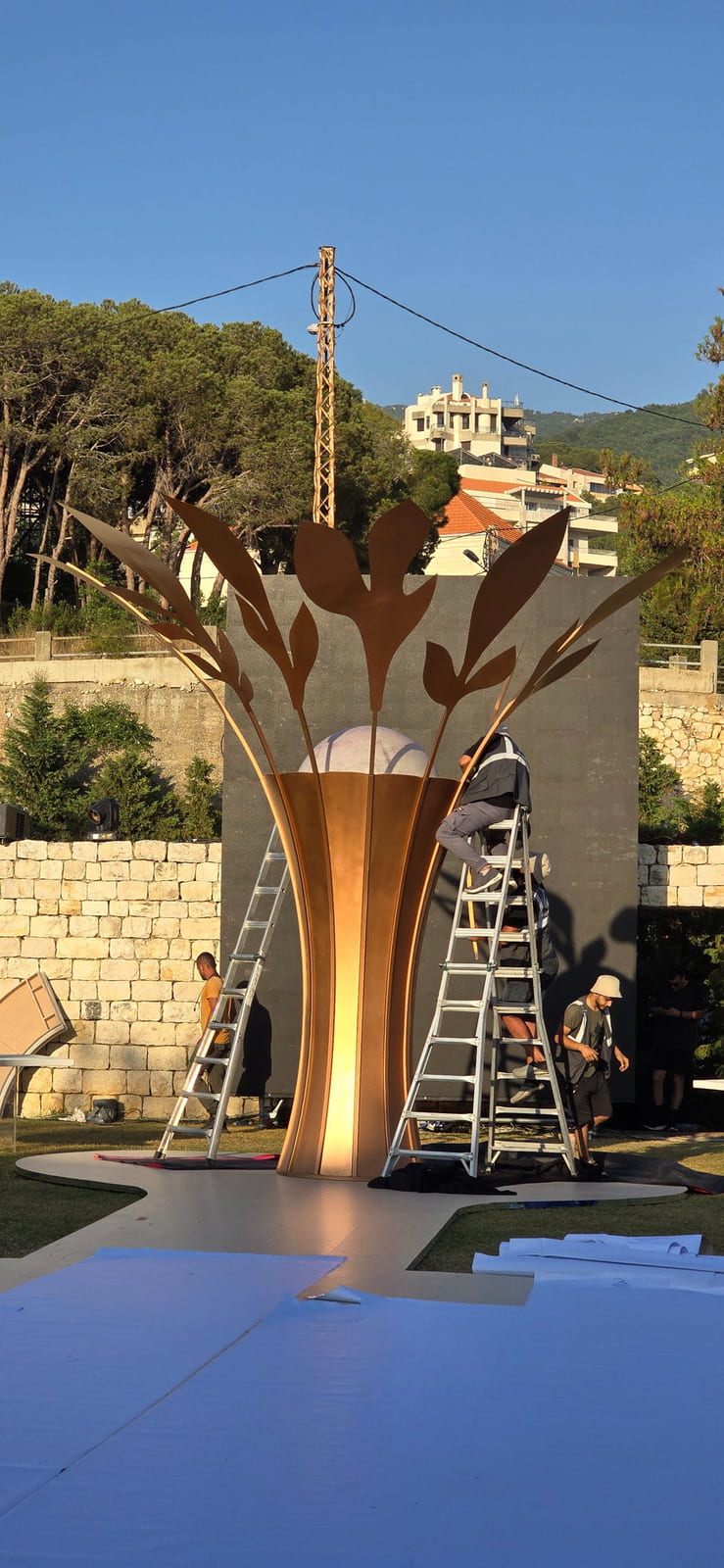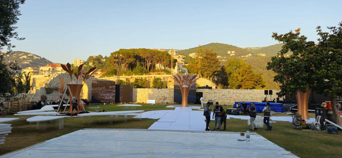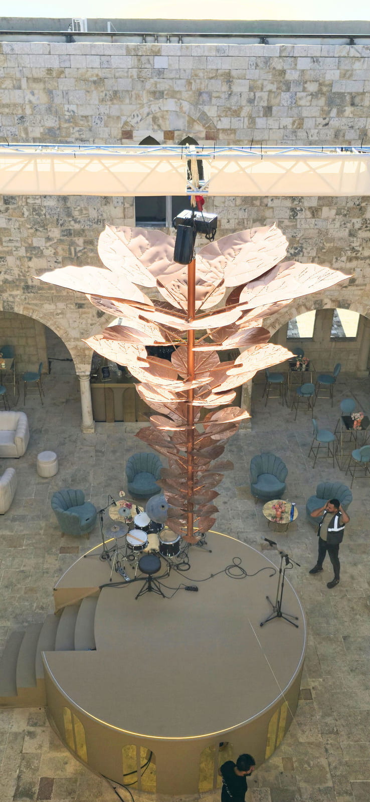 A bespoke outdoor wedding where we built the full infrastructure, including the central dancefloor, flowing catwalks, sculptural tree installations, and a statement oversized chandelier suspended above the stage. The layout structured guest circulation and seating while blending contemporary elements with the venue’s historic architecture, creating a bold yet elegant celebration setting.
