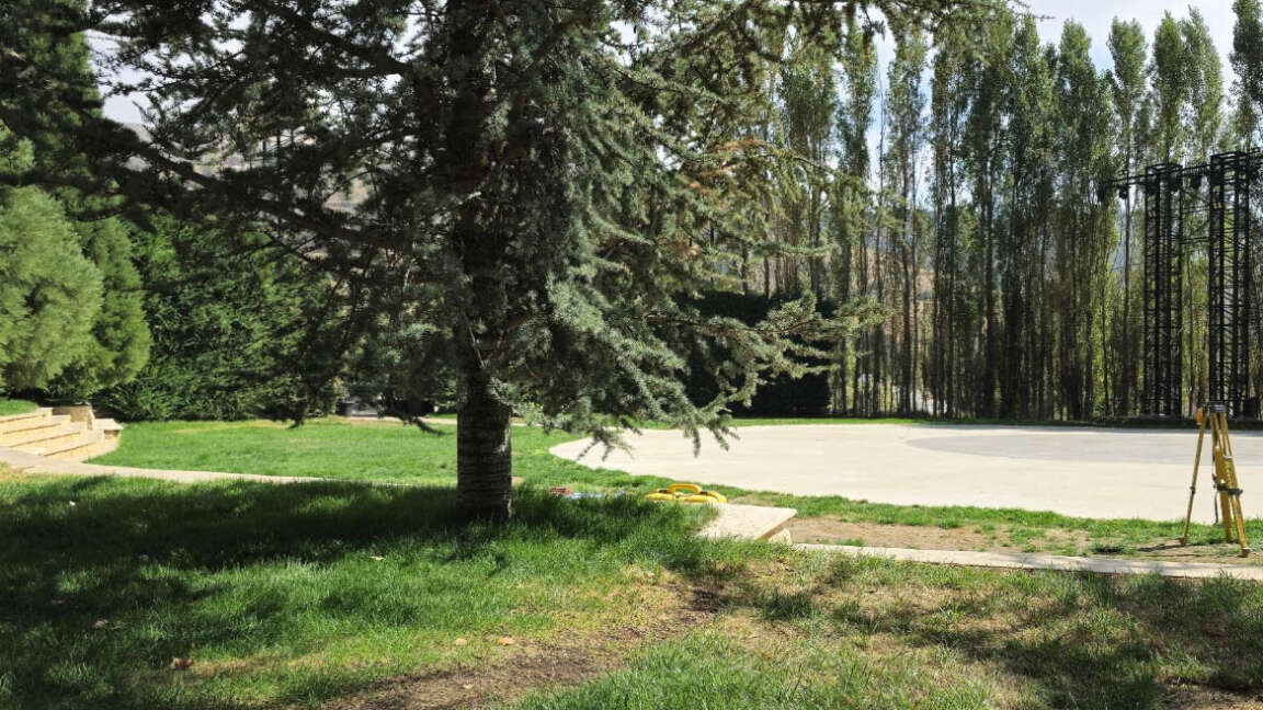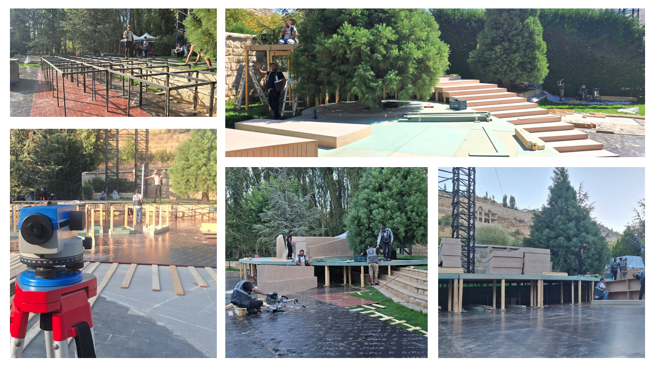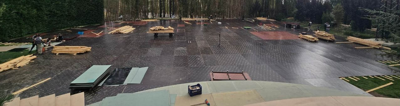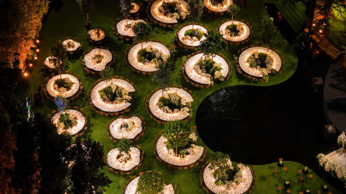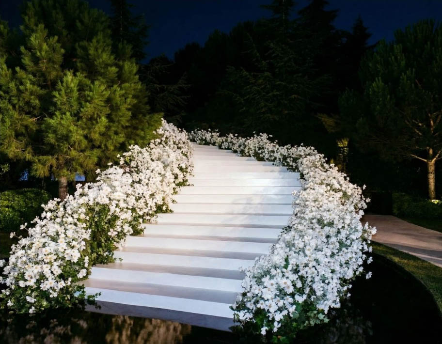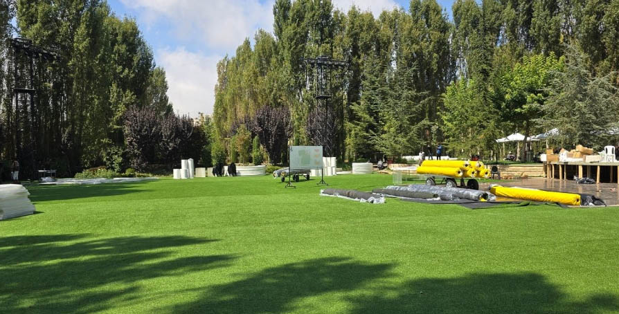 For this exceptional wedding celebration, our team executed a large-scale outdoor transformation covering over 2,000 sqm of flooring, seamlessly finished with lush artificial grass for a refined natural look. A stunning curved bridal entrance, elegantly designed and finished in pure white, served as a central architectural highlight, guiding guests into the event space with a graceful and modern aesthetic. The band stage and dancefloor were strategically positioned to enhance visibility and ambiance. The dancefloor, crafted with high-gloss reflective black vinyl panels, created a striking contrast against the greenery and amplified the lighting reflections throughout the night — delivering a truly sophisticated and cinematic atmosphere.