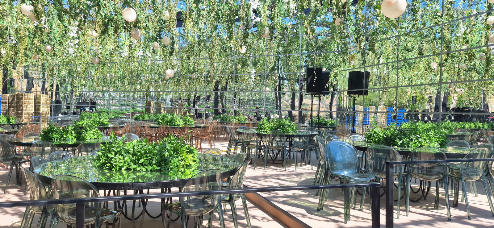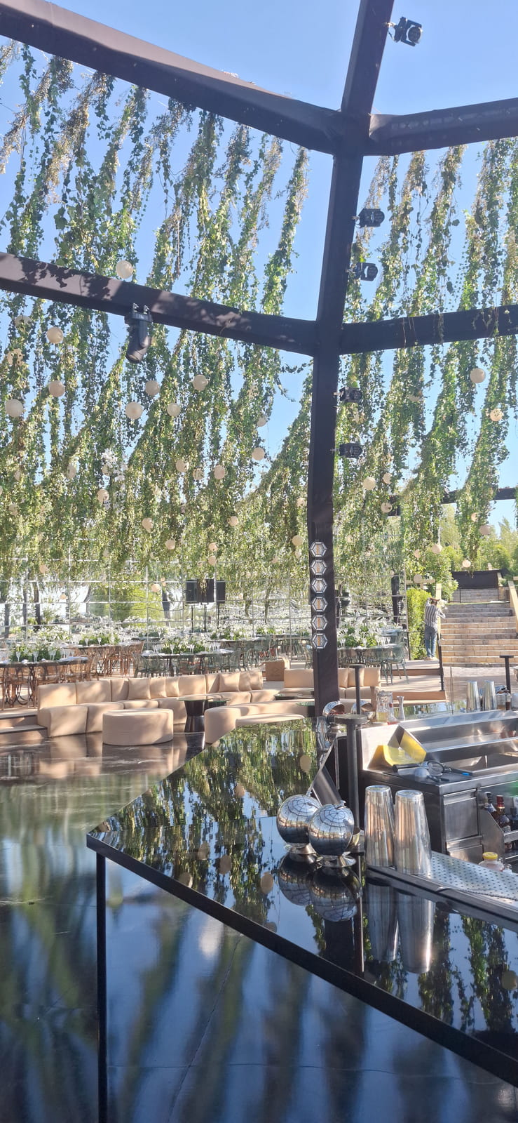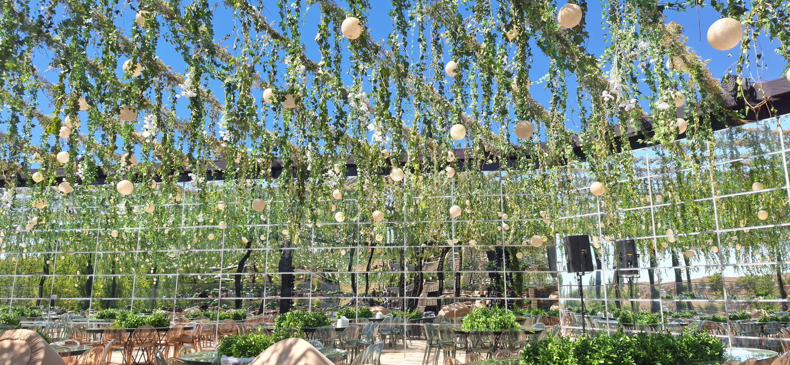 To enhance the sense of space and visual drama, 4-meter-high mirror walls will be installed strategically around the venue. These mirrors will reflect lighting effects, the central bar, and the surrounding greenery - creating an illusion of infinite depth and sophistication.
