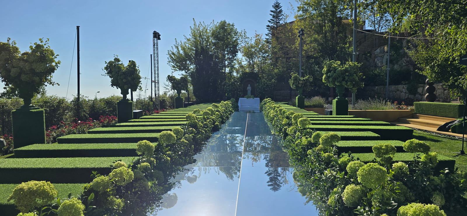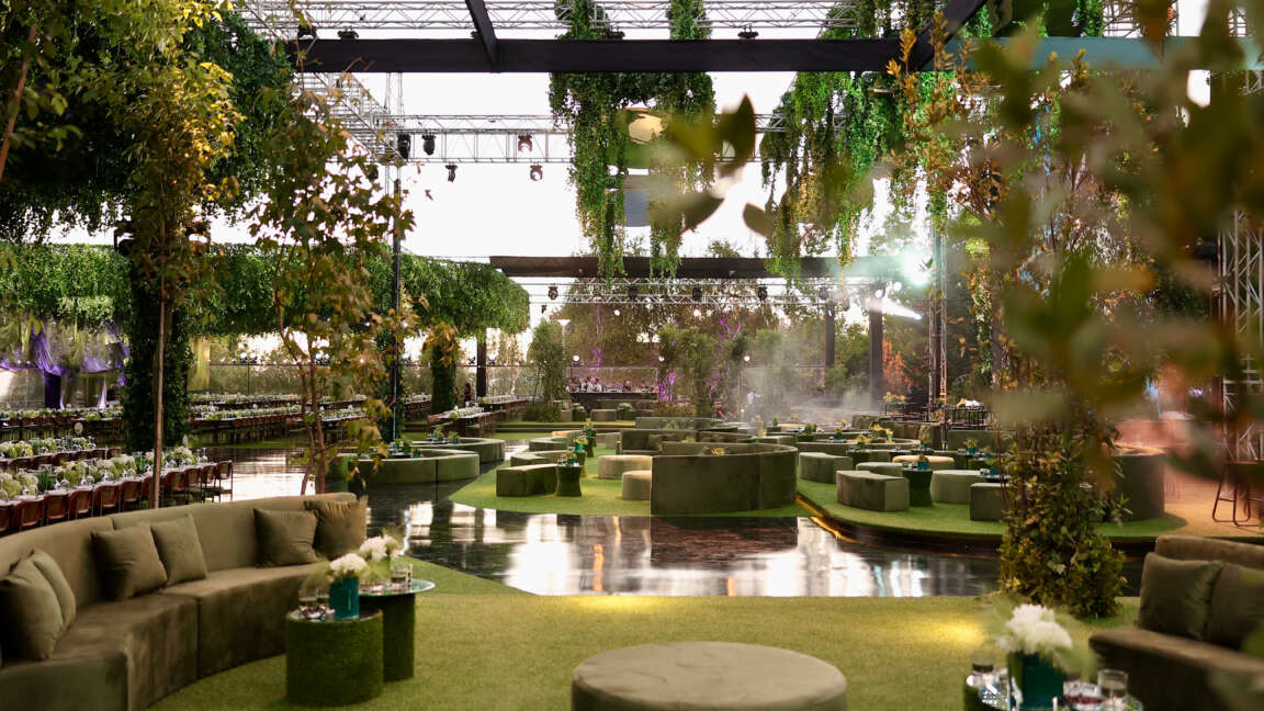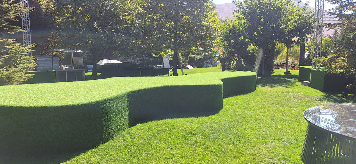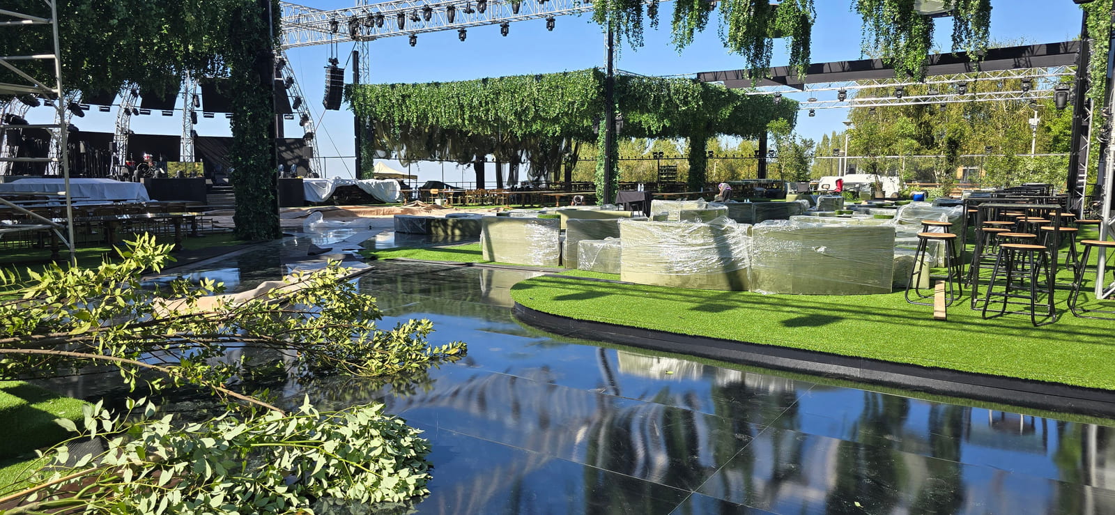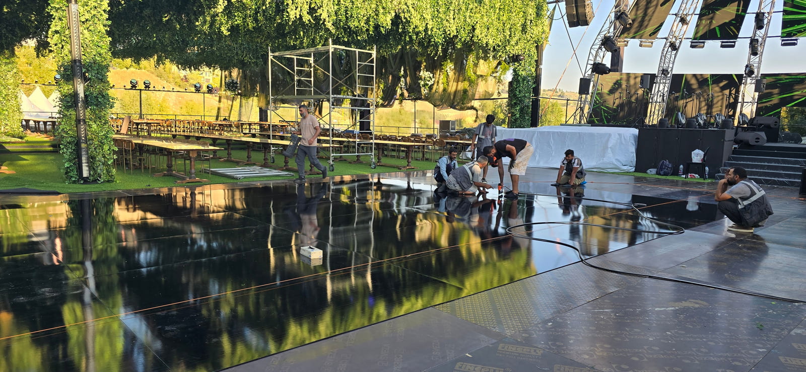 For this wedding, we installed more than 250 sqm of custom platforms covered with grass, blending natural textures with a structured layout. The floor was finished with grass and black glossy vinyl panels, forming a striking dancefloor area. A reflective-panel ceremony path and grass-covered benches completed the setup, alongside a multi-level band stage fully covered with black carpet.
