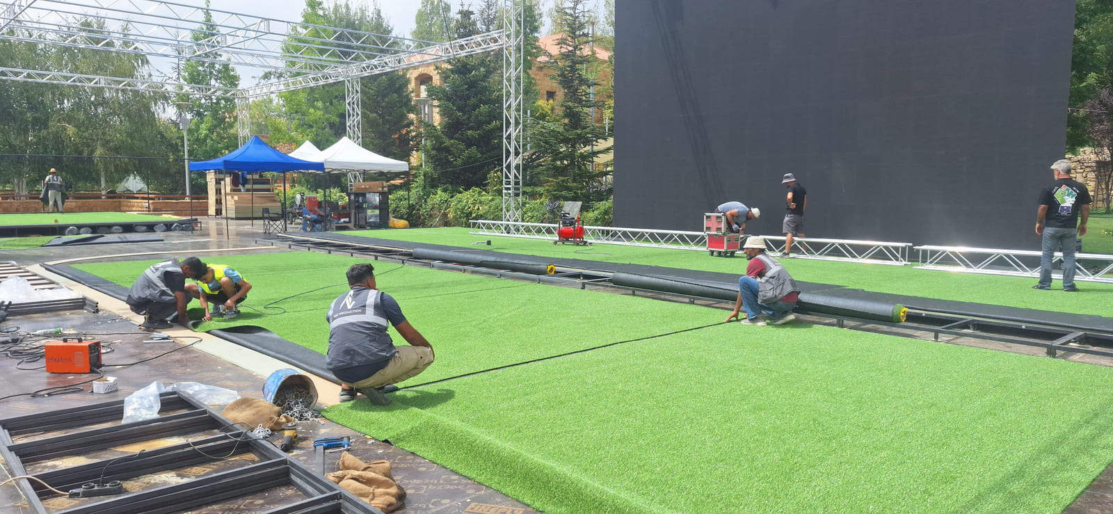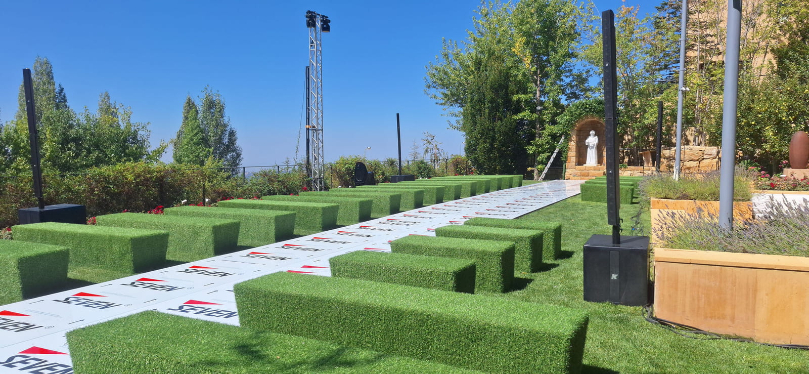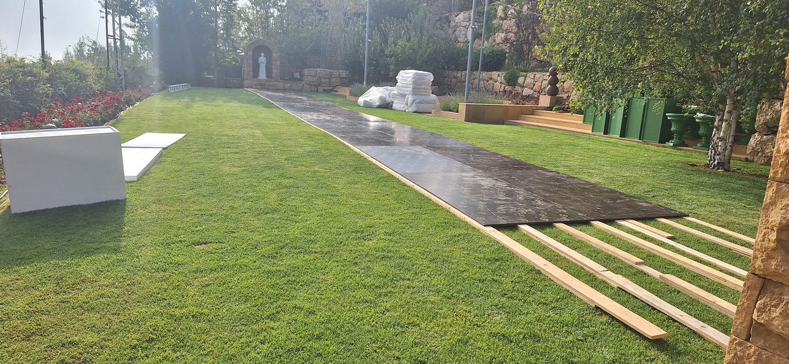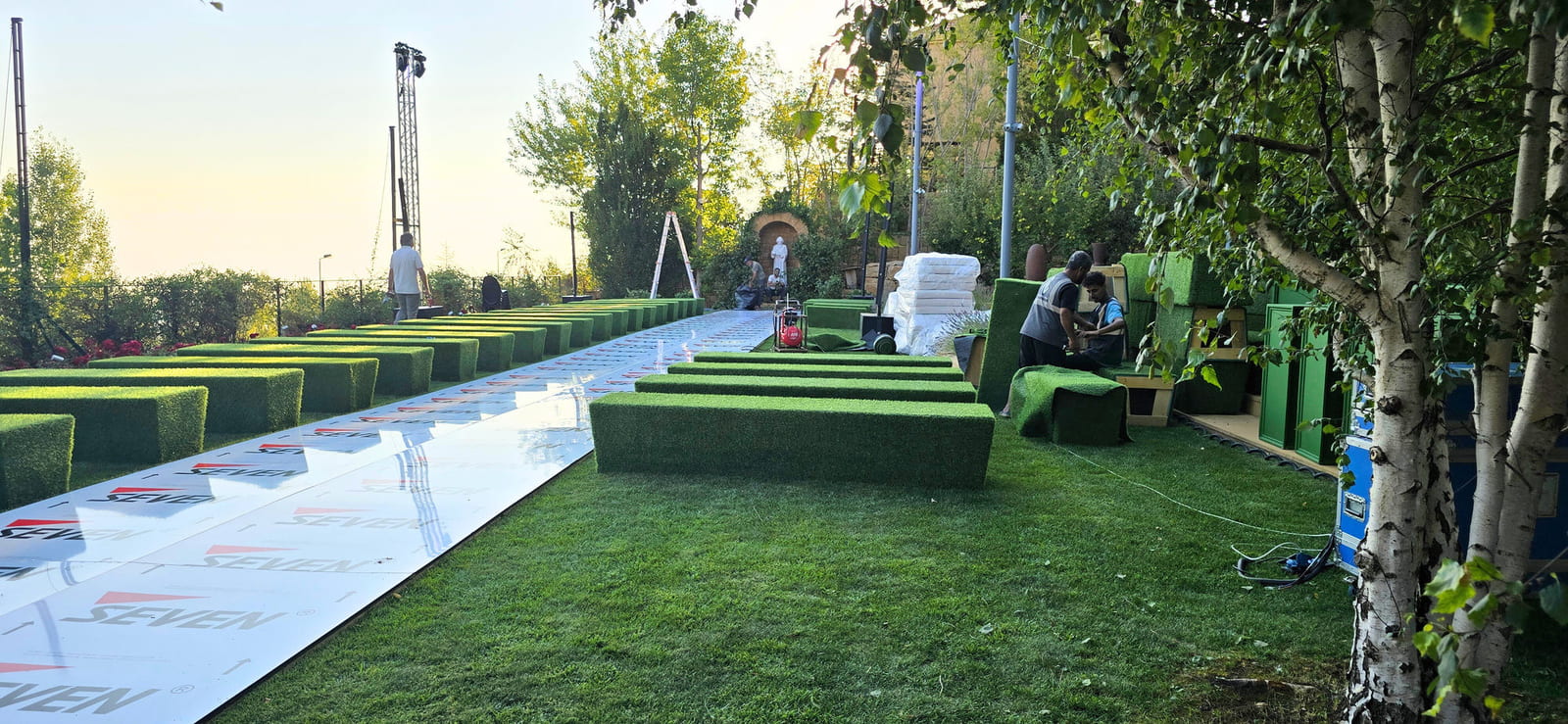 For this wedding, we installed more than 250 sqm of custom platforms covered with grass, blending natural textures with a structured layout. The floor was finished with grass and black glossy vinyl panels, forming a striking dancefloor area. A reflective-panel ceremony path and grass-covered benches completed the setup, alongside a multi-level band stage fully covered with black carpet.