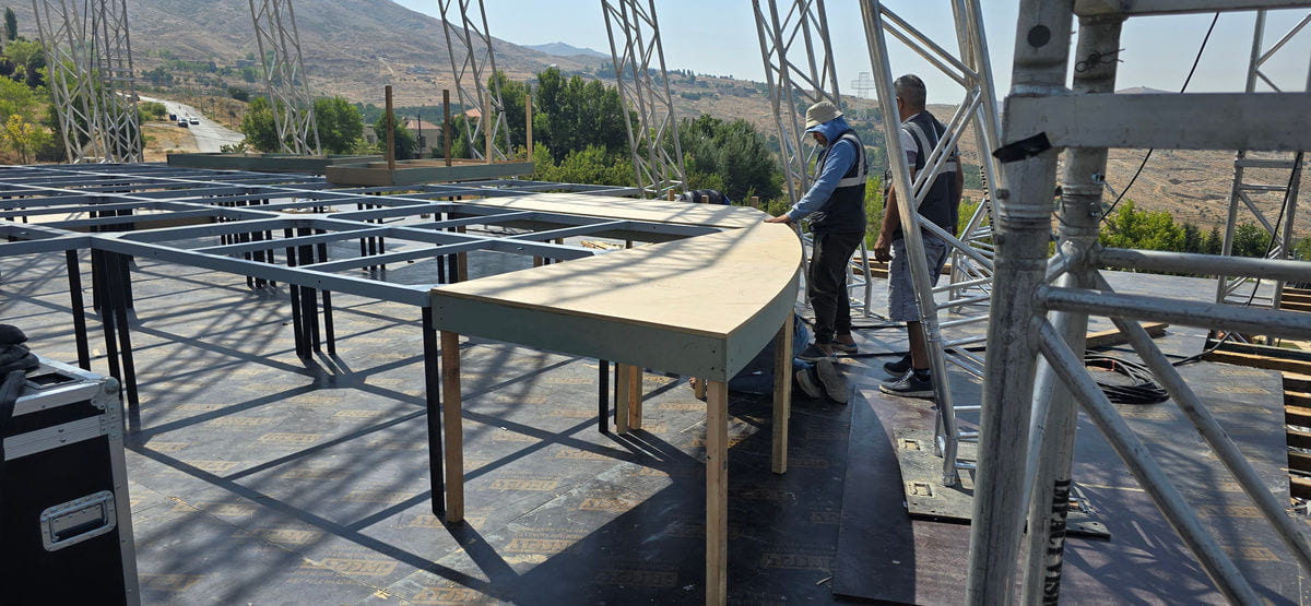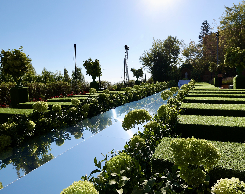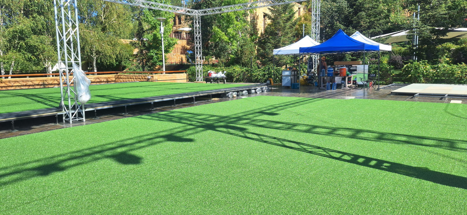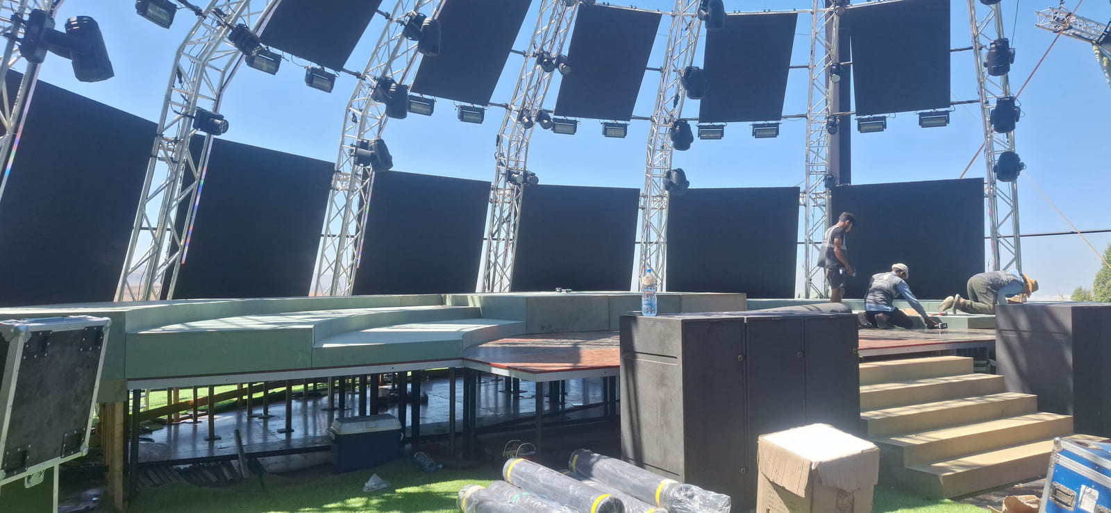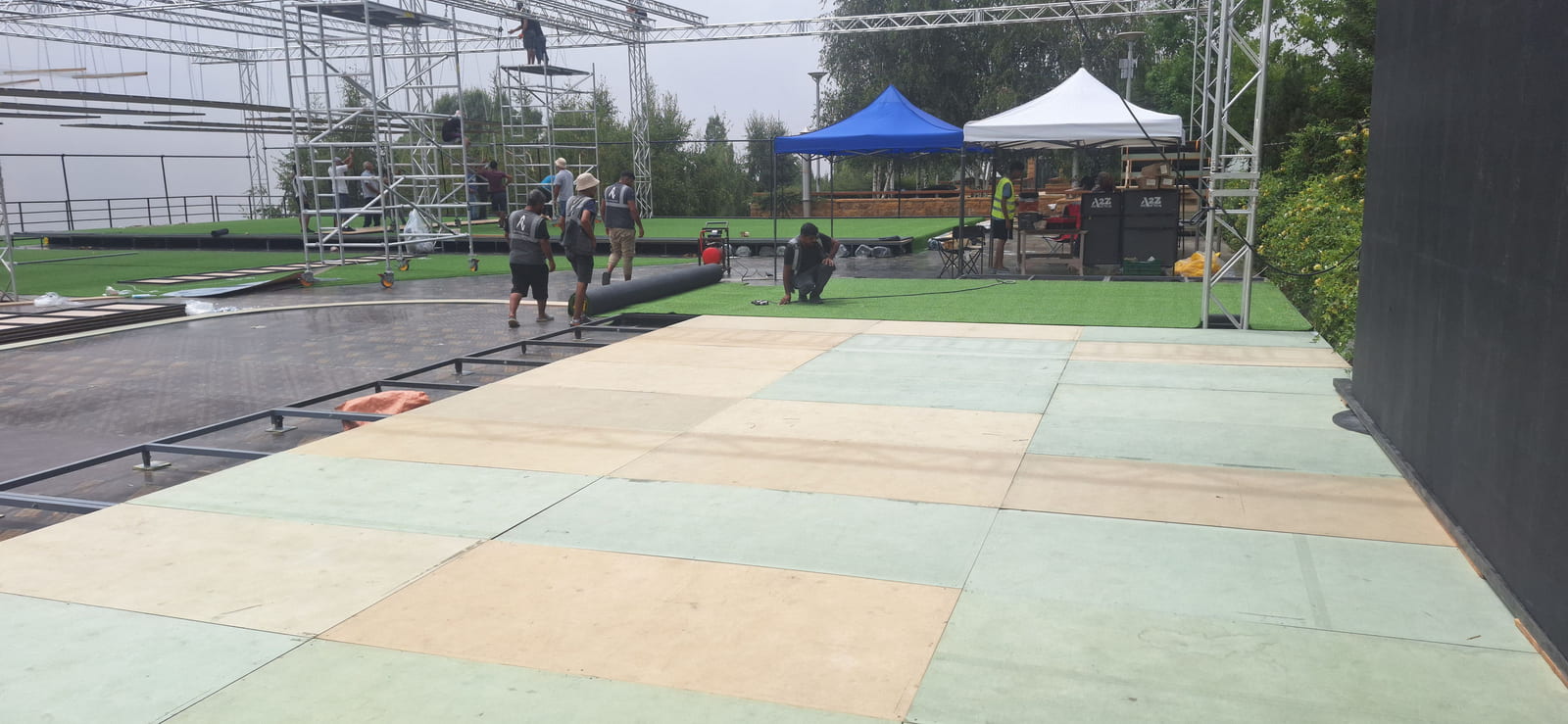 For this wedding, we installed more than 250 sqm of custom platforms covered with grass, blending natural textures with a structured layout. The floor was finished with grass and black glossy vinyl panels, forming a striking dancefloor area. A reflective-panel ceremony path and grass-covered benches completed the setup, alongside a multi-level band stage fully covered with black carpet.