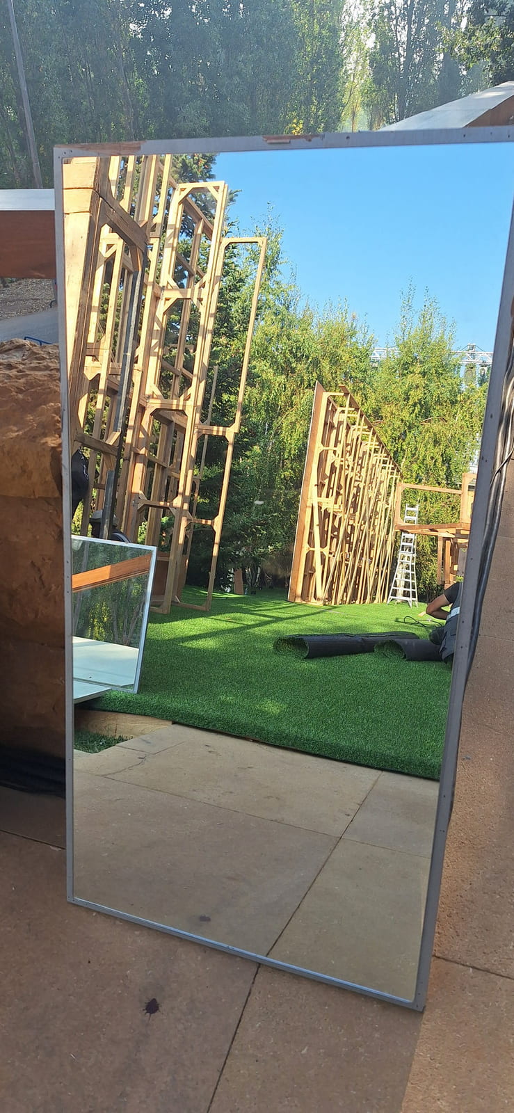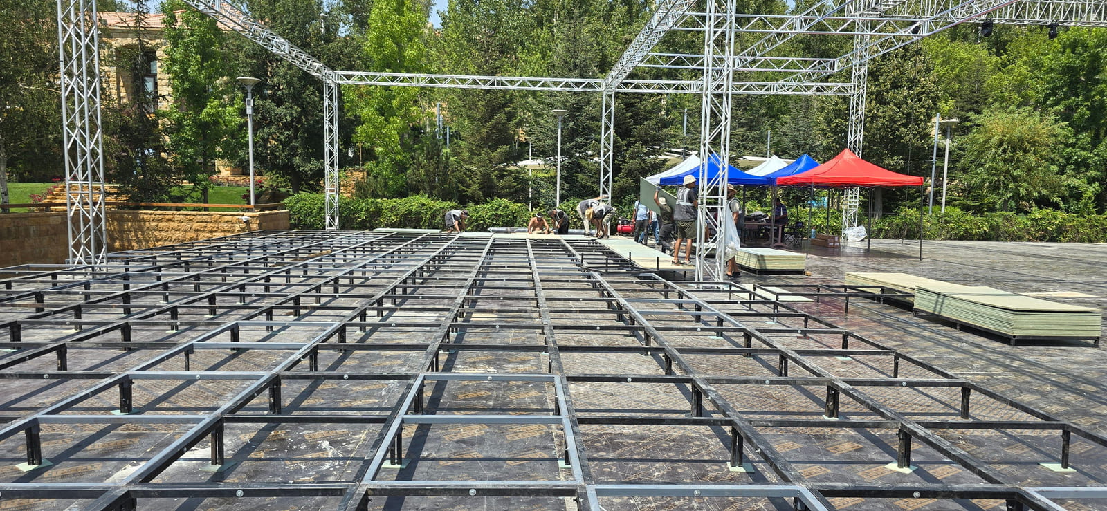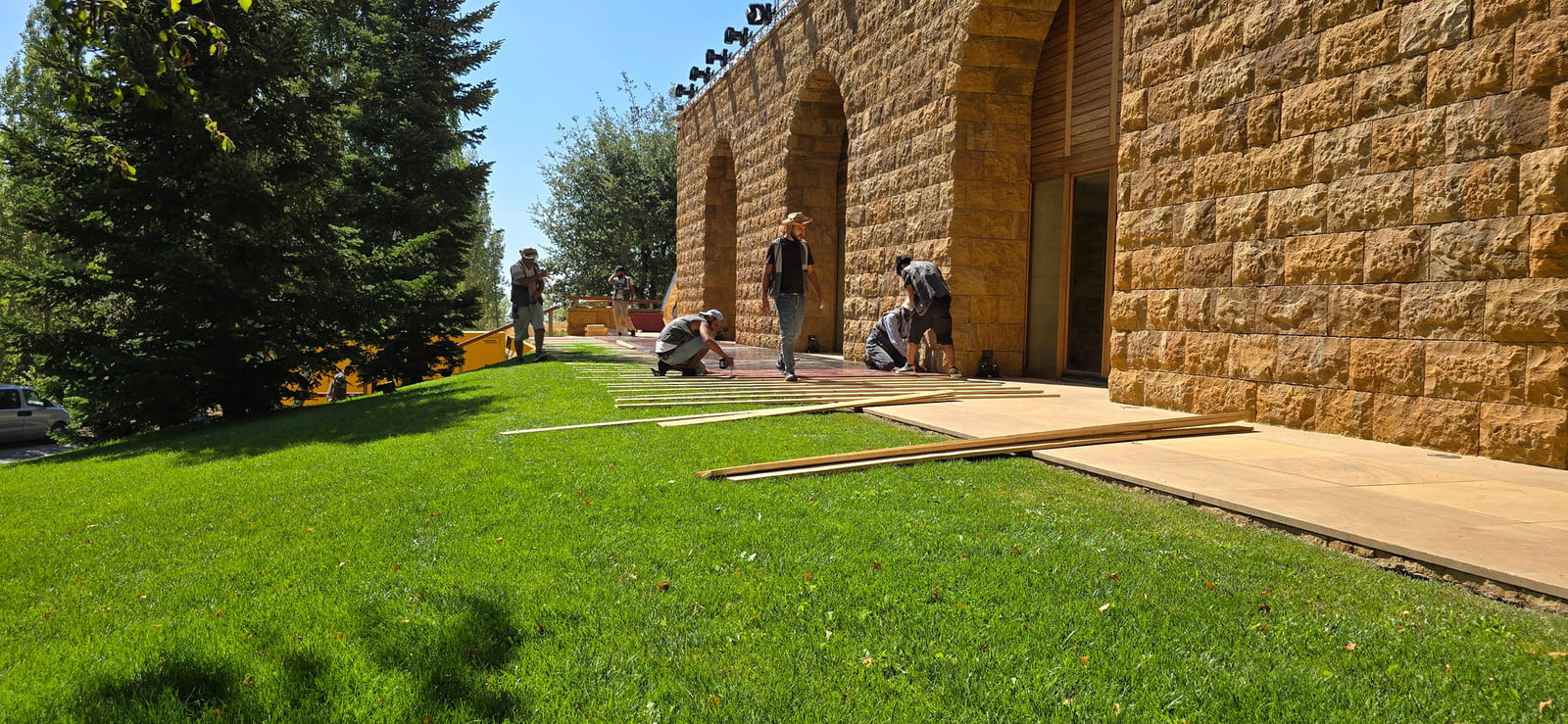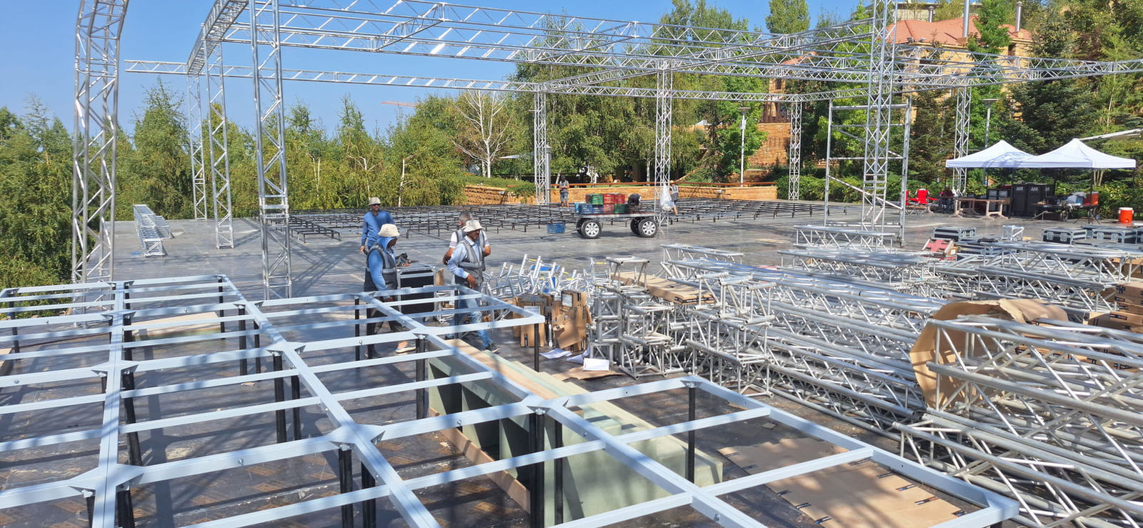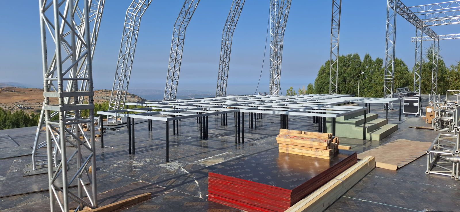 For this wedding, we installed more than 250 sqm of custom platforms covered with grass, blending natural textures with a structured layout. The floor was finished with grass and black glossy vinyl panels, forming a striking dancefloor area. A reflective-panel ceremony path and grass-covered benches completed the setup, alongside a multi-level band stage fully covered with black carpet.