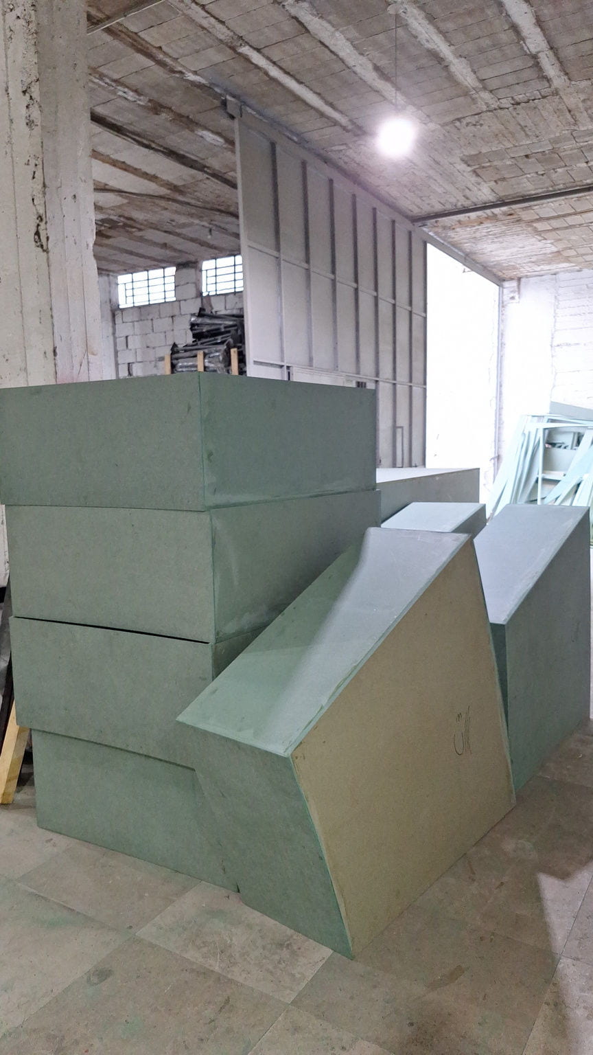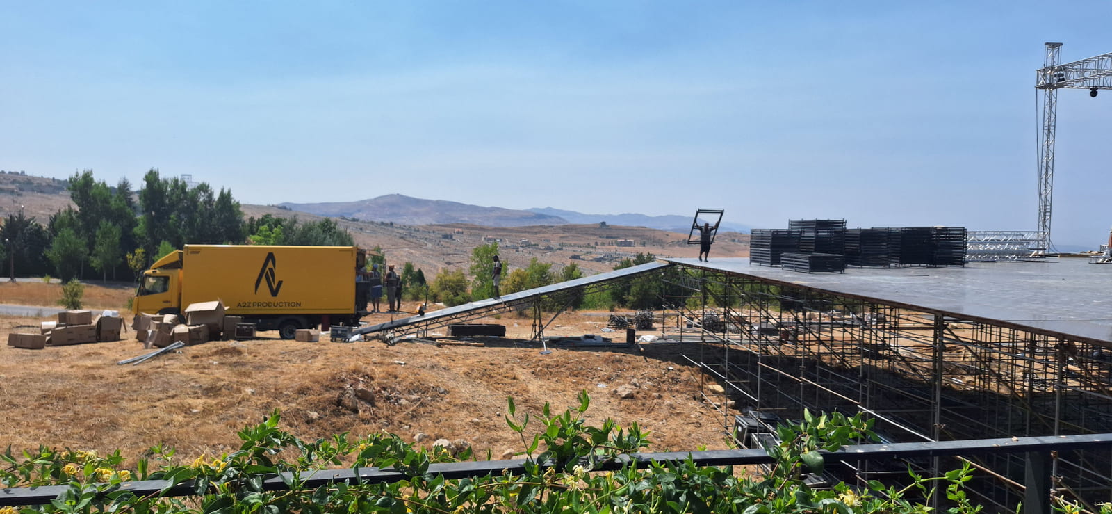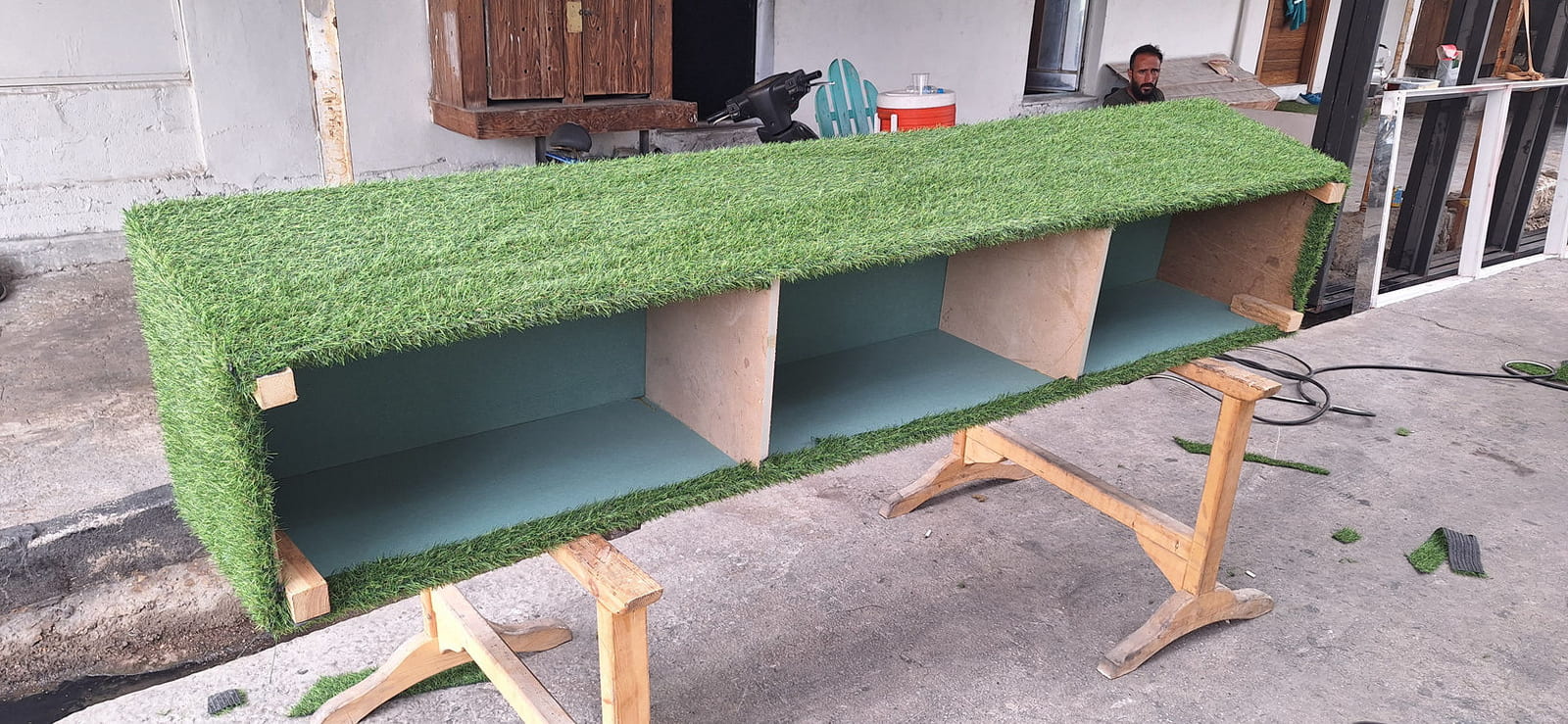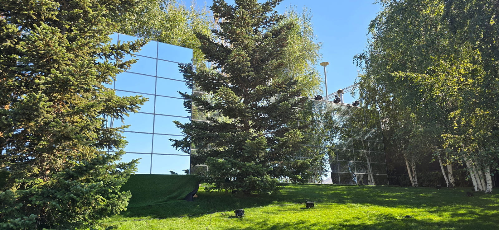 For this wedding, we installed more than 250 sqm of custom platforms covered with grass, blending natural textures with a structured layout. The floor was finished with grass and black glossy vinyl panels, forming a striking dancefloor area. A reflective-panel ceremony path and grass-covered benches completed the setup, alongside a multi-level band stage fully covered with black carpet.