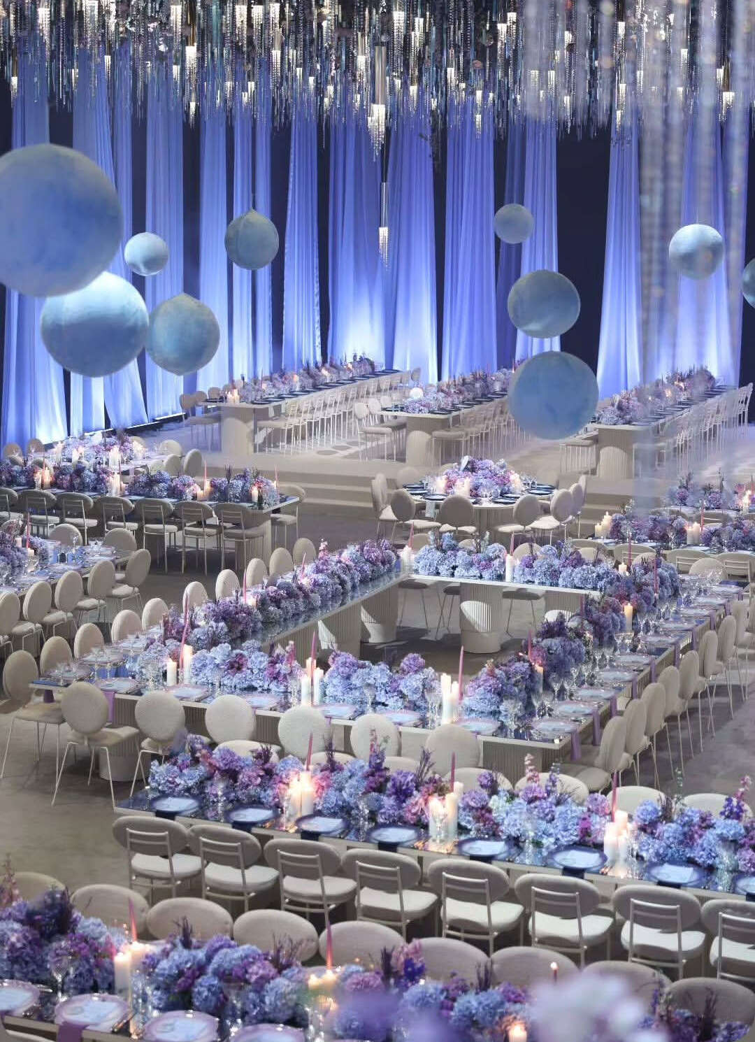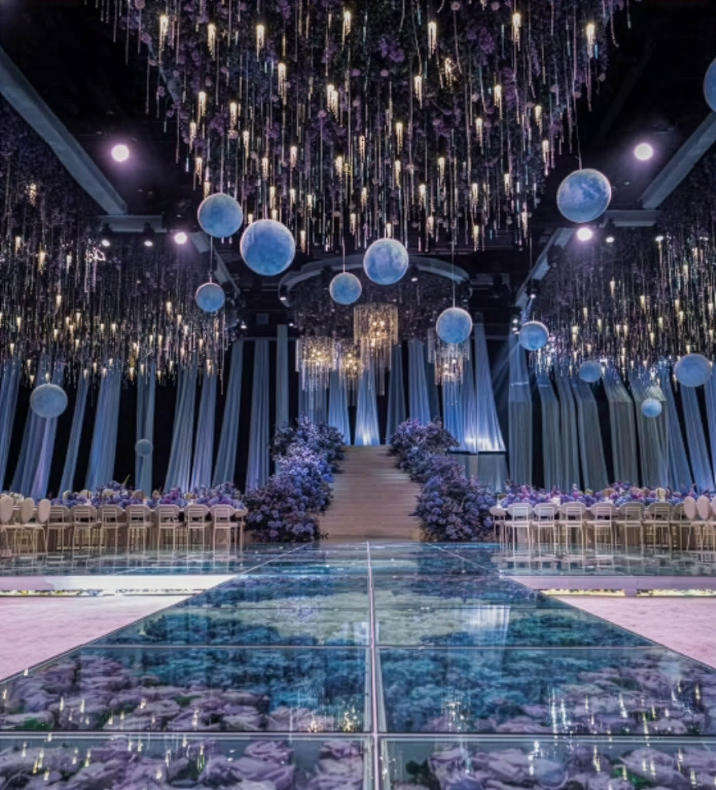 Overview the design showcases a breathtaking glass dance floor suspended above a vibrant bed of flowers, surrounded by subtle led lighting that highlights its beauty and depth. A grand bridal staircase creates a dramatic entrance, leading to an expansive setup of over 500 sqm of platforms on both sides for guests. The welcome area exudes luxury, featuring mirror walls that amplify space and light, complemented by rich purple carpet flooring that adds warmth and elegance to the overall ambiance.