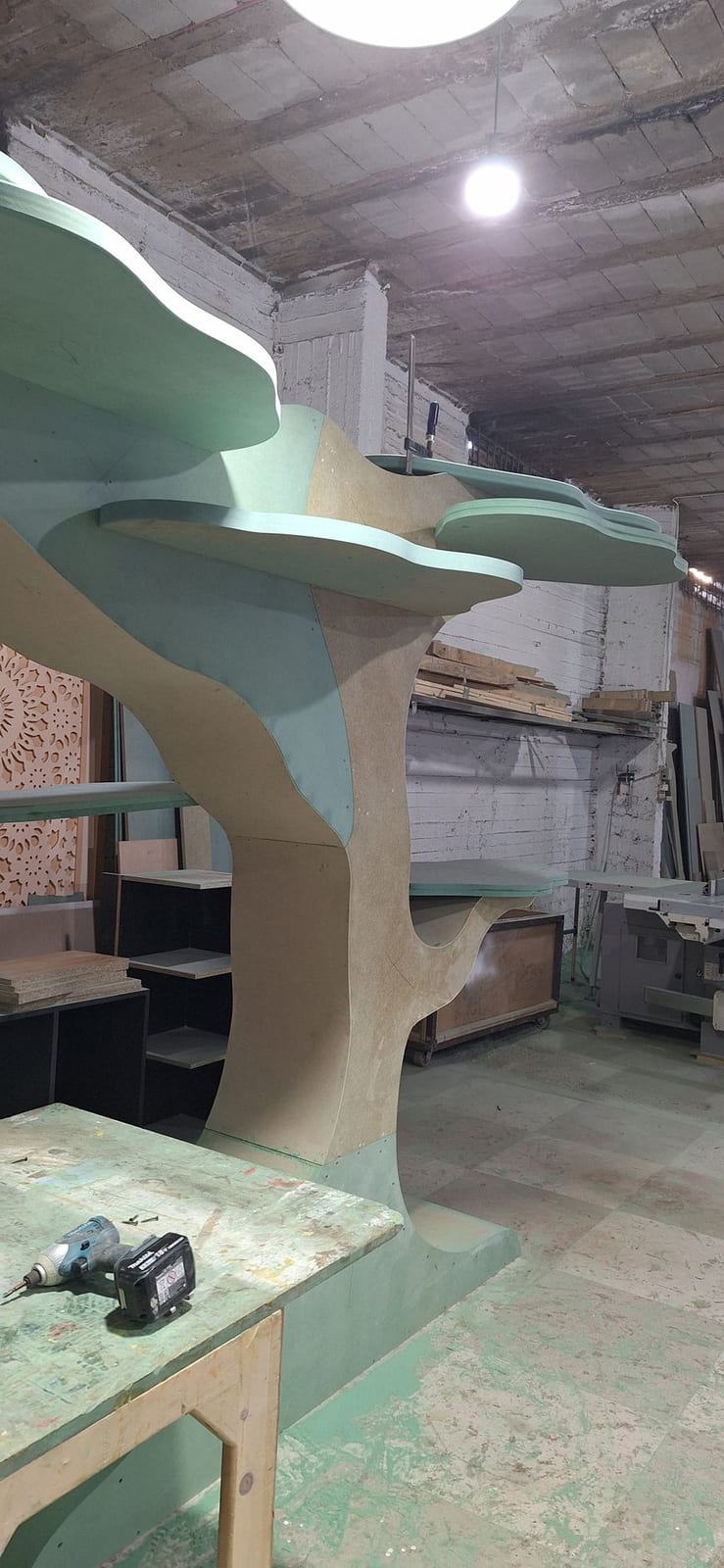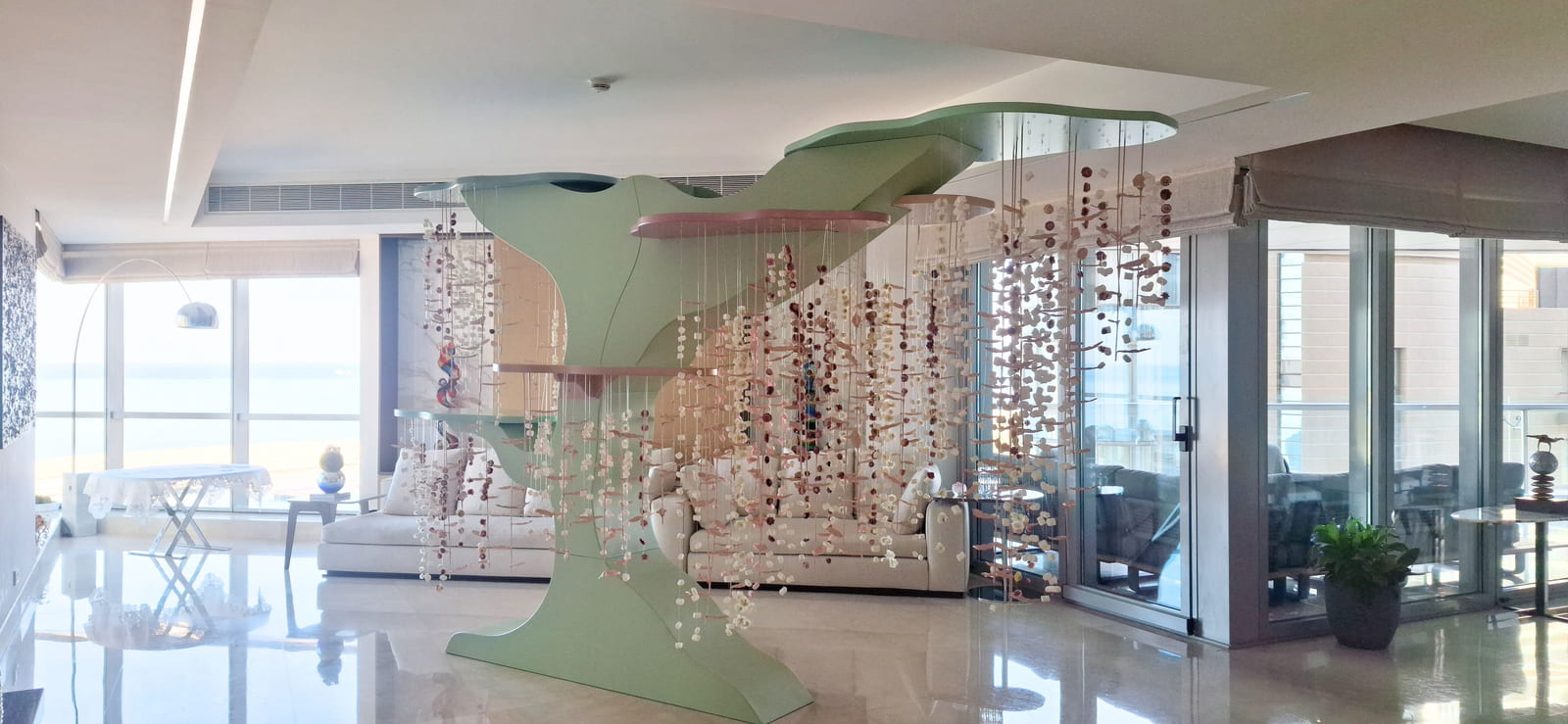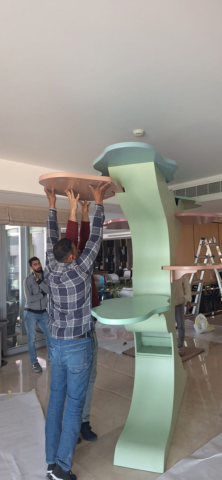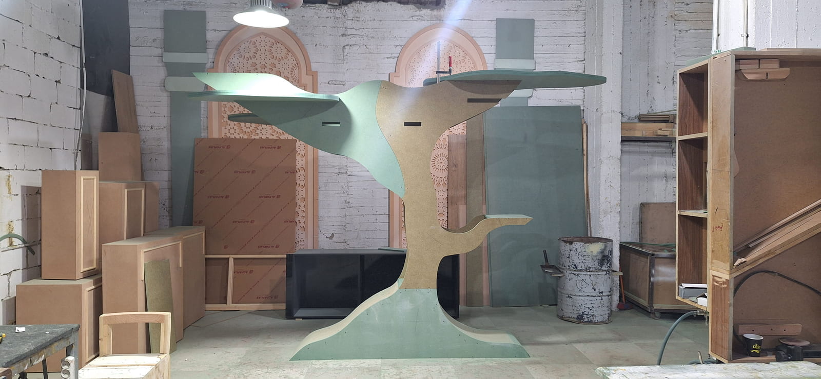 A custom wooden tree was designed and installed within a limited space inside a private apartment. The structure served as a dessert display, with steel-crafted leaves integrated to support and present the desserts, combining sculptural design with functional use.
