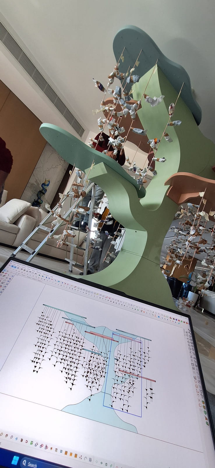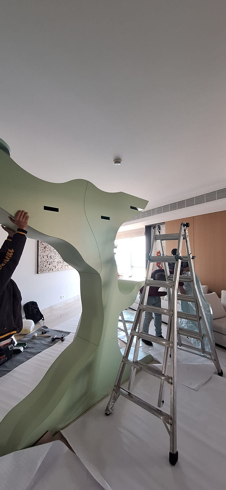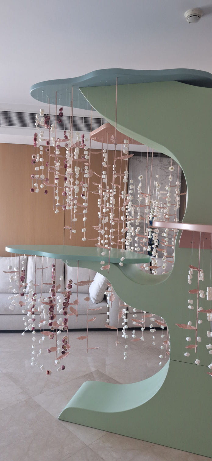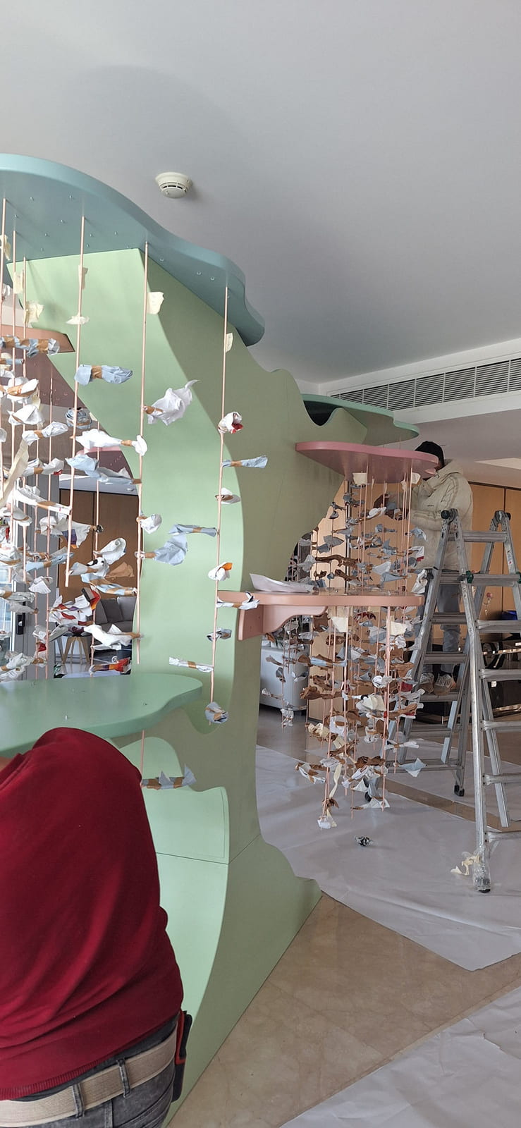 A custom wooden tree was designed and installed within a limited space inside a private apartment. The structure served as a dessert display, with steel-crafted leaves integrated to support and present the desserts, combining sculptural design with functional use.
