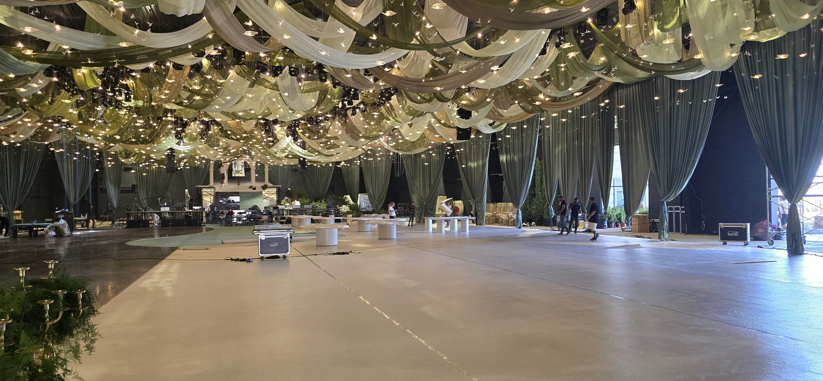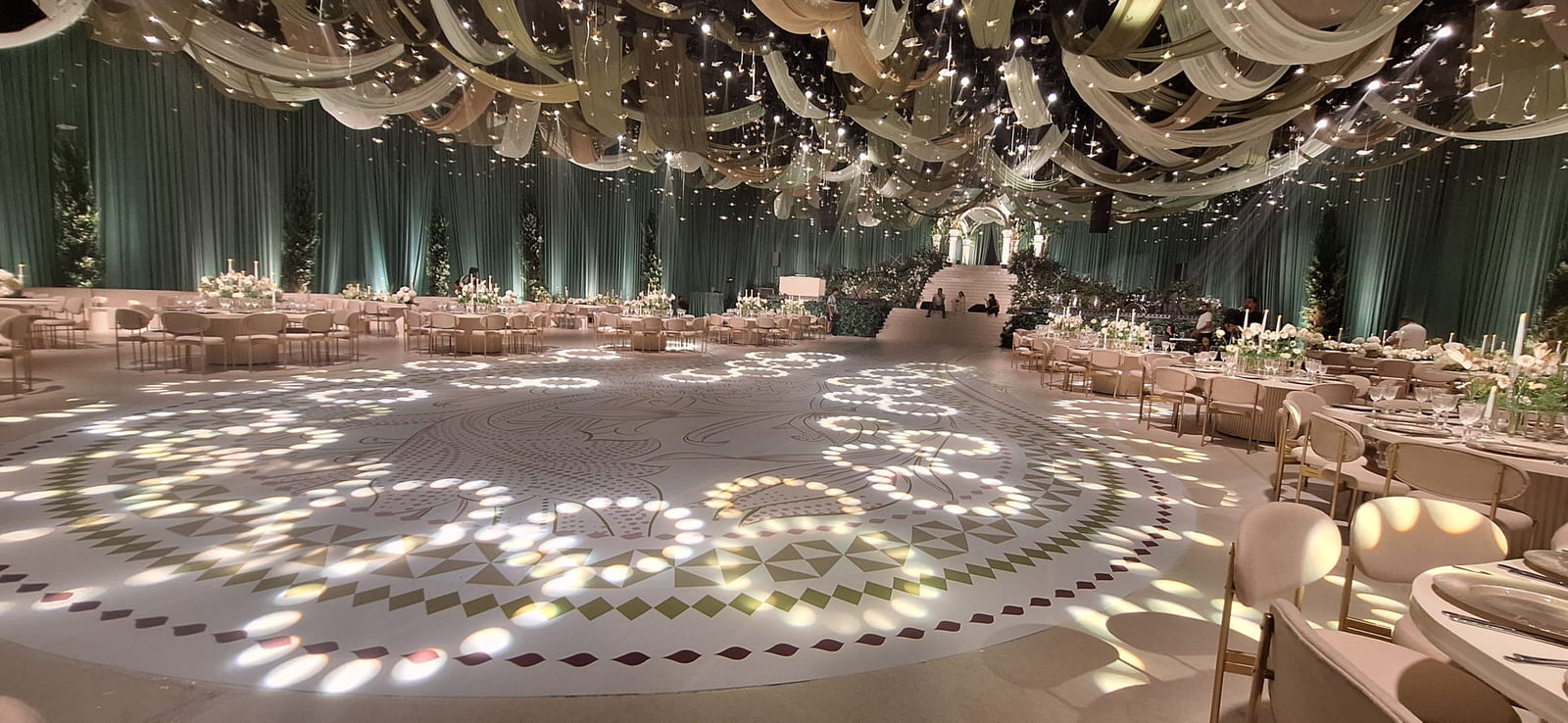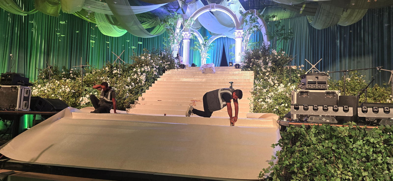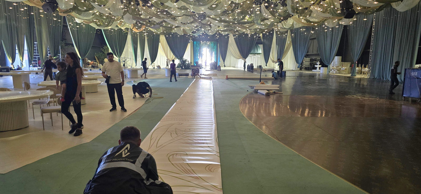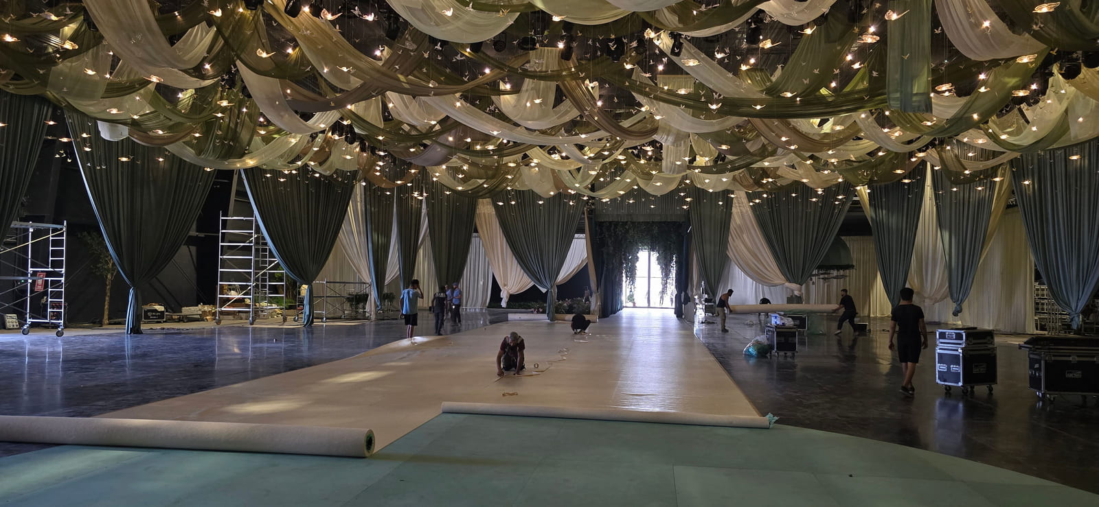 This project involves transforming a large space into a bespoke, luxurious wedding venue. The core work includes laying over 1000 sqm of plywood and carpet for the main floor. A focal point is the construction of a bridal entrance staircase, leading to a custom, wavy- shaped dance floor finished with printed vinyl. Structural and decorative elements feature a dedicated steel entrance gate and elegant grass boxes detailing the buffet area, ensuring a cohesive and grand aesthetic.