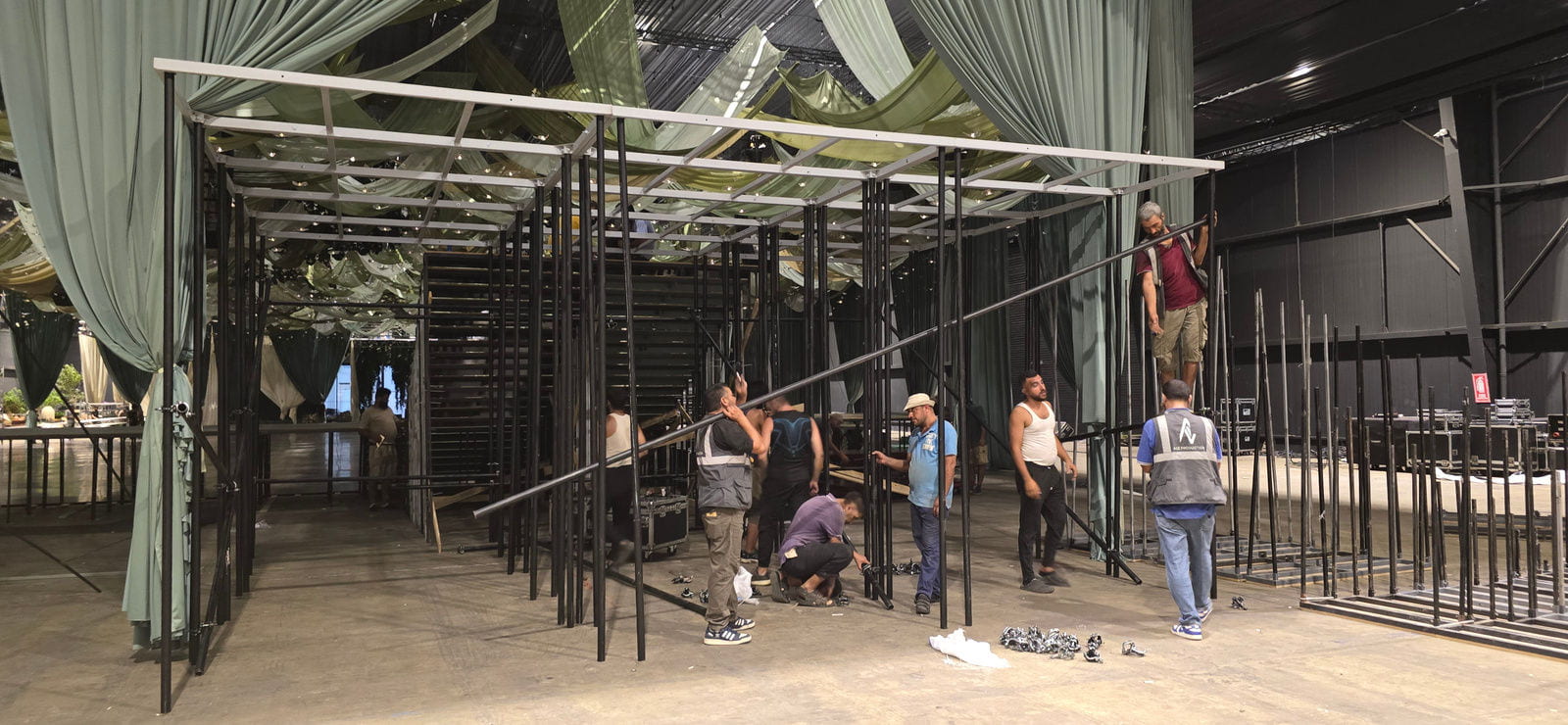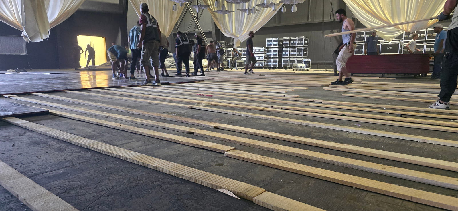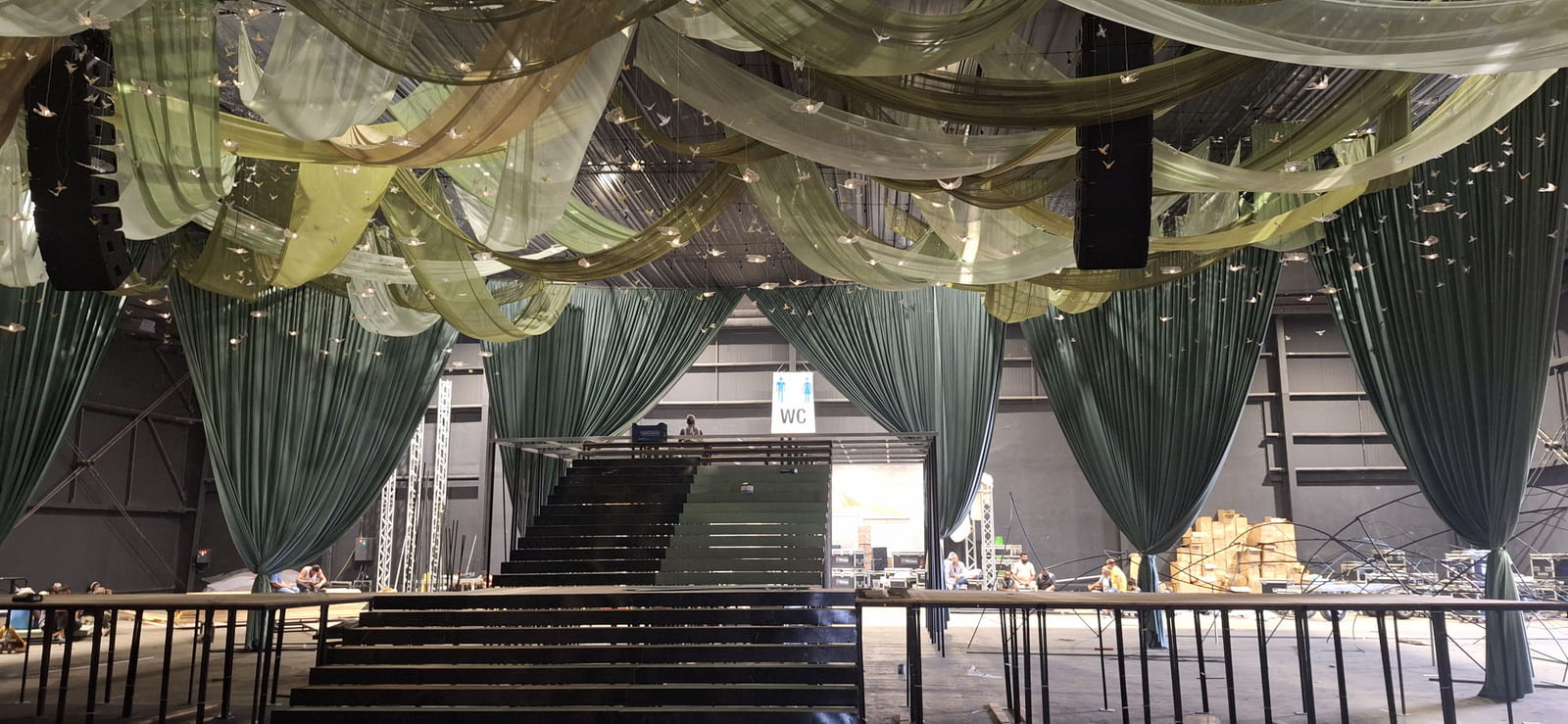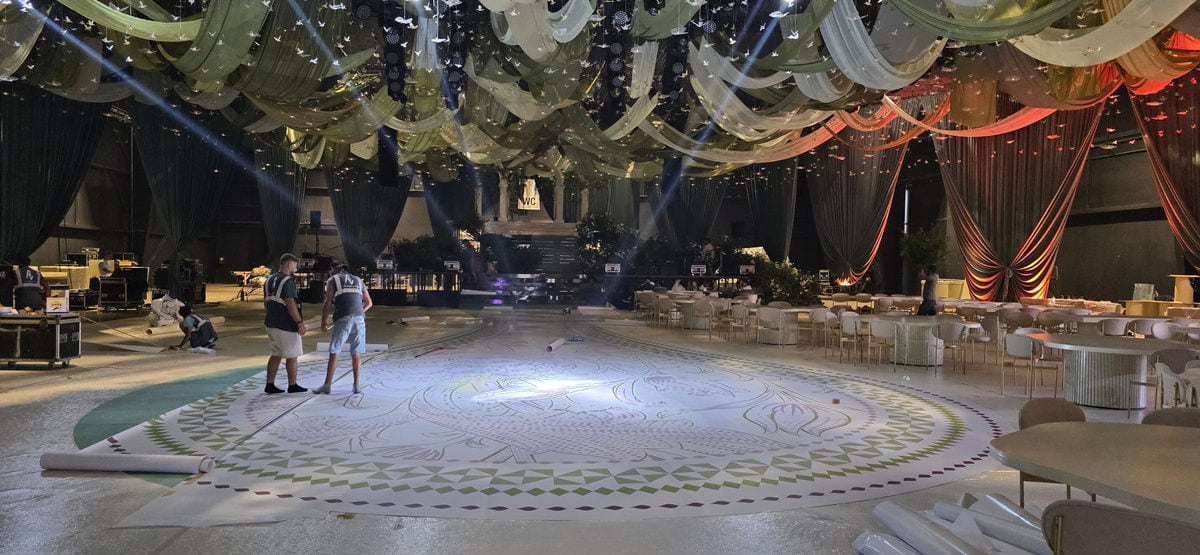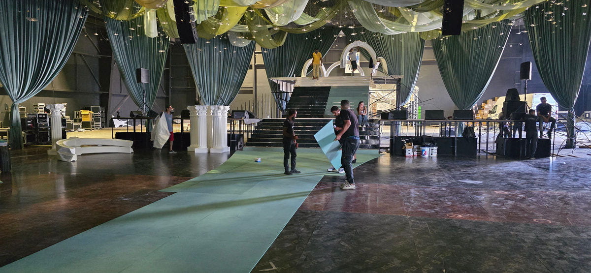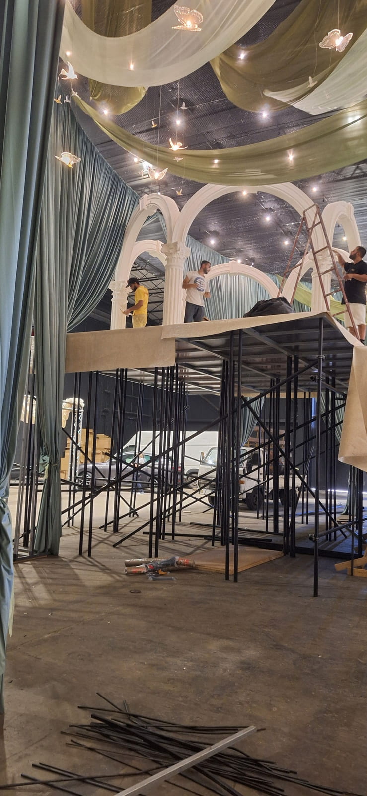 This project involves transforming a large space into a bespoke, luxurious wedding venue. The core work includes laying over 1000 sqm of plywood and carpet for the main floor. A focal point is the construction of a bridal entrance staircase, leading to a custom, wavy- shaped dance floor finished with printed vinyl. Structural and decorative elements feature a dedicated steel entrance gate and elegant grass boxes detailing the buffet area, ensuring a cohesive and grand aesthetic.
