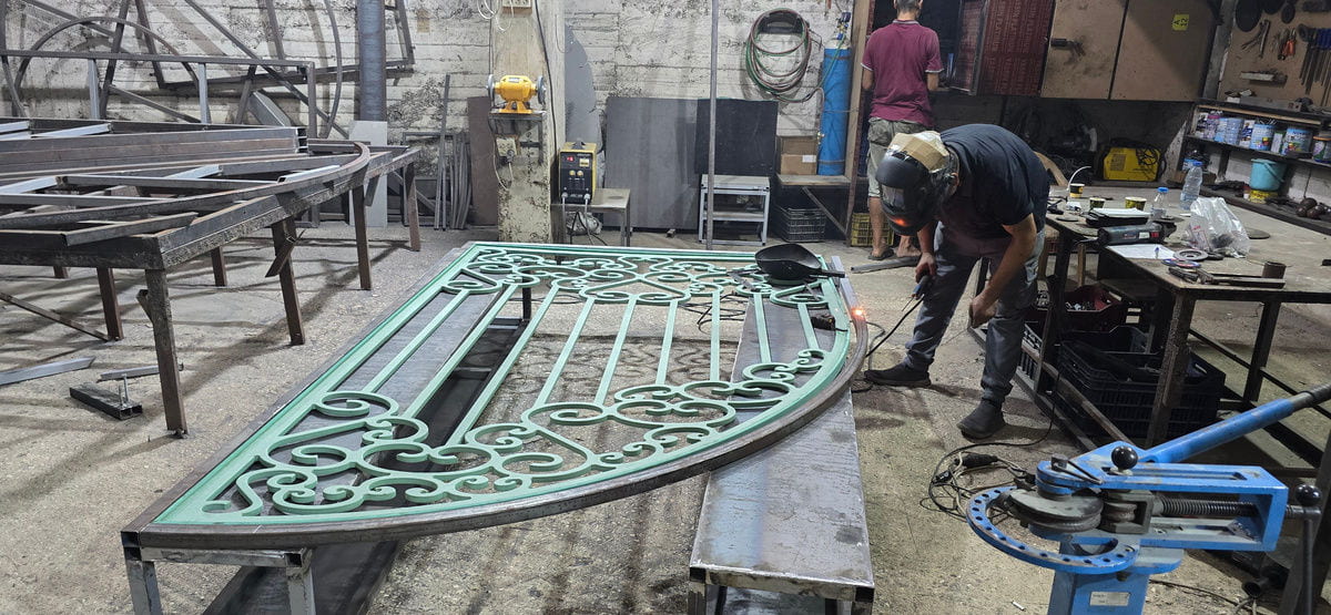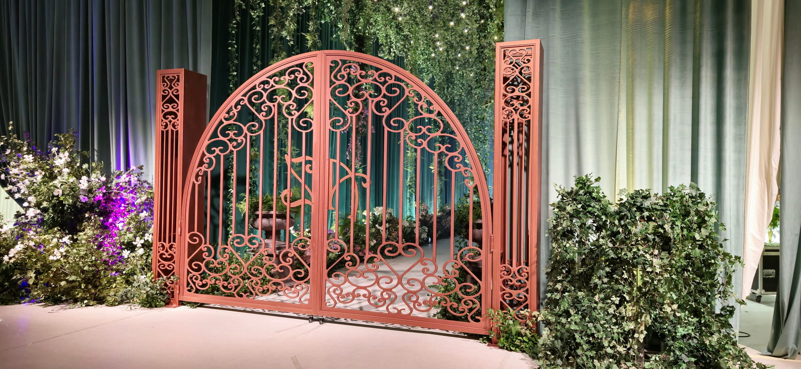 This grand entrance gate is the event's decorative threshold, setting a luxurious, fairy-tale tone. It features a sturdy structure of steel and wood, expertly painted to showcase detailed scrollwork and a tall, arched design.