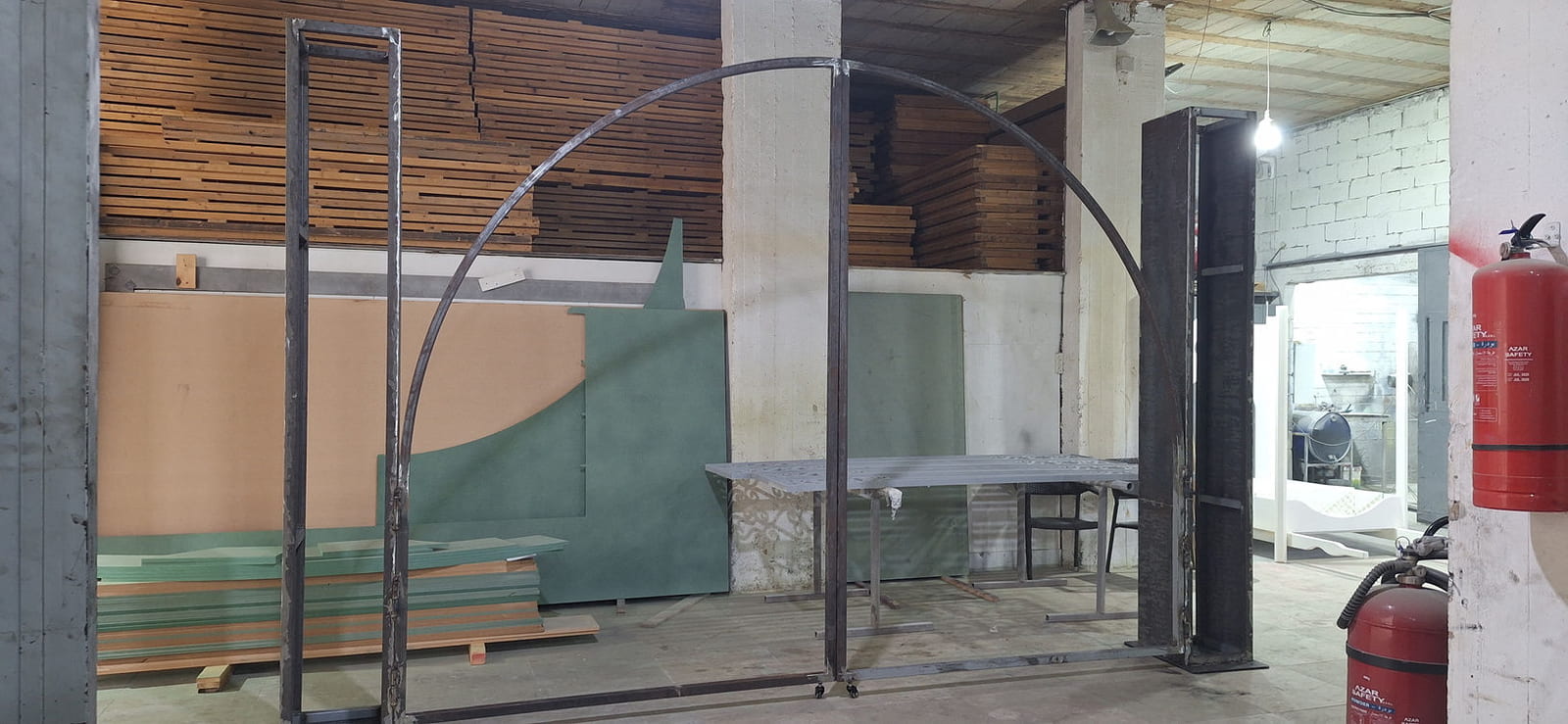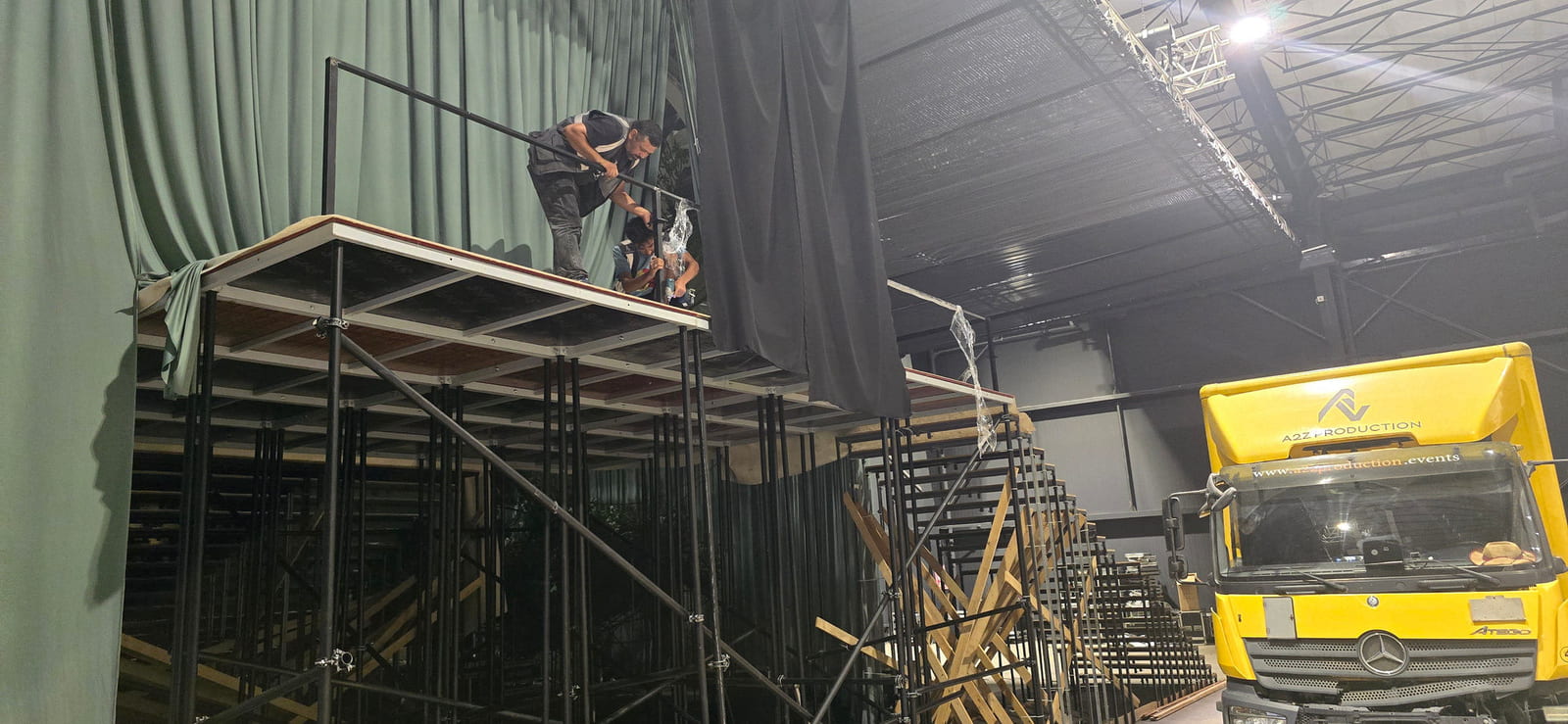 This stunning construction serves as the ceremonial focal point of the wedding venue, reaching an imposing height of 3.5 meters. It features a wide, white grand staircase built on a steel structure paneled with mdf. The stairs are covered in carpet on the treads and finished with decorative fabric on the sides.