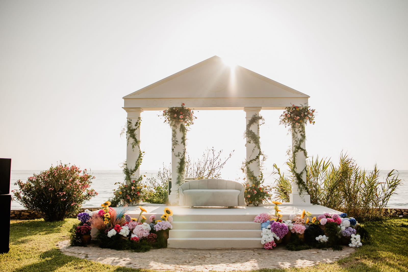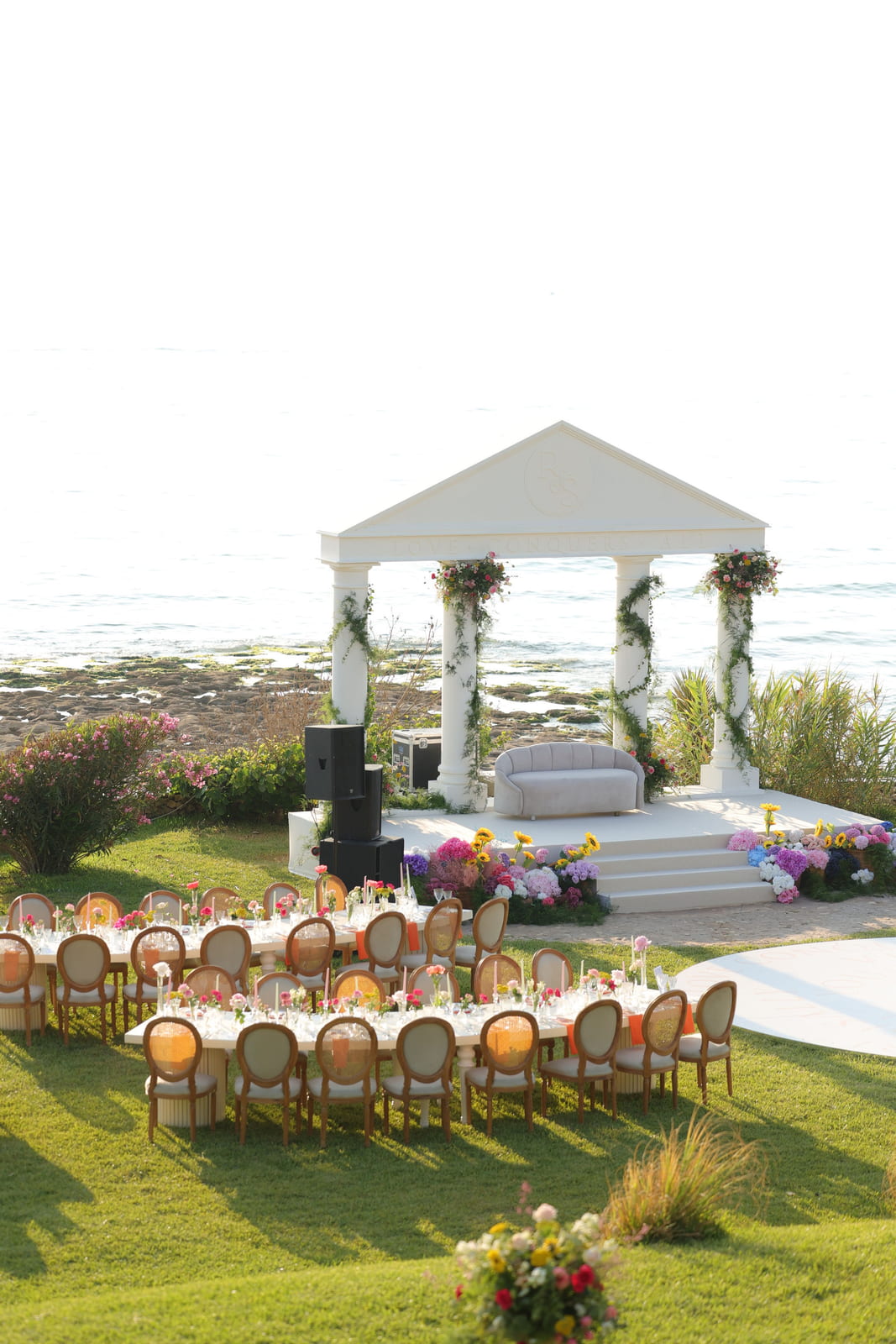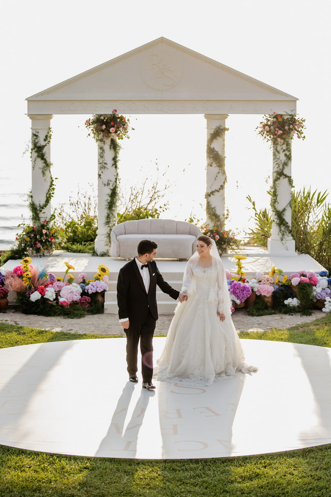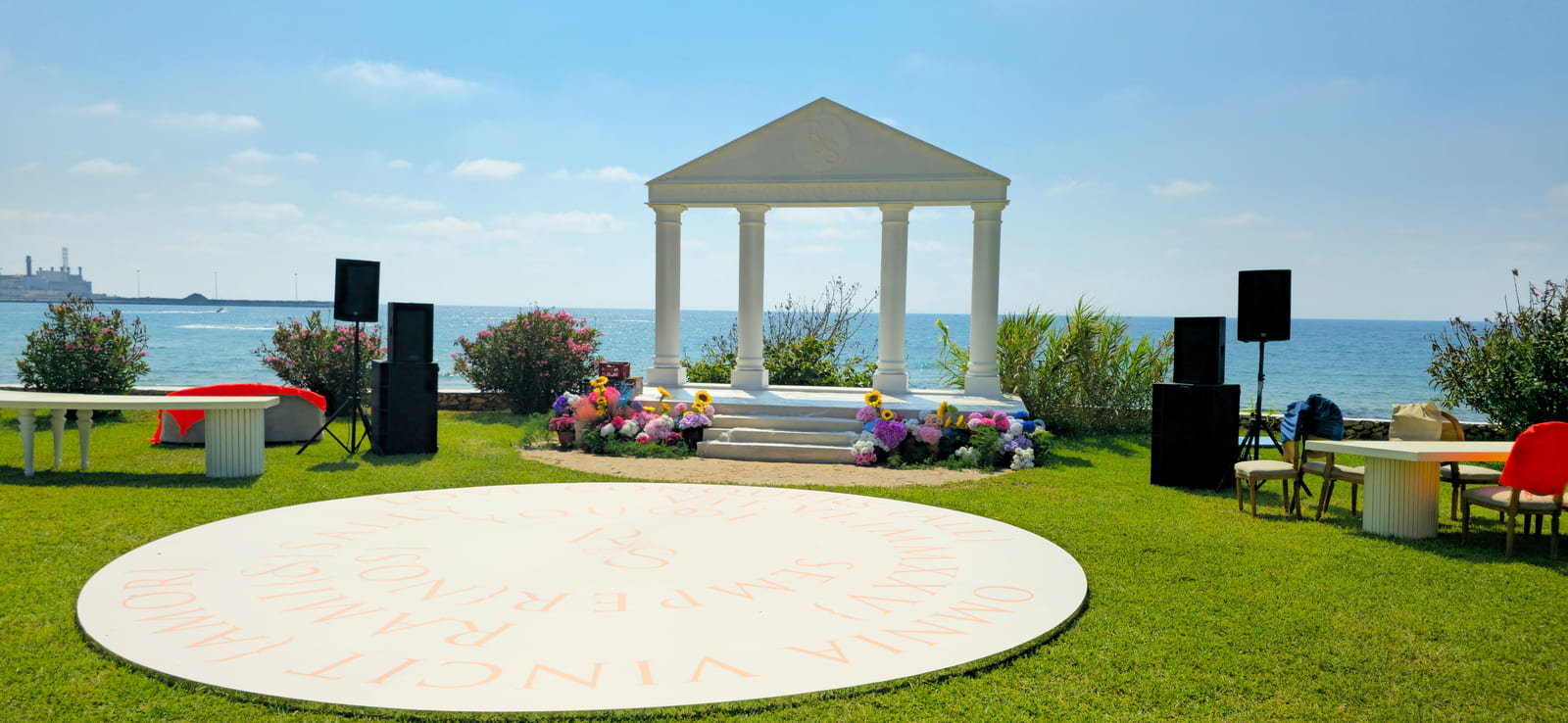 The setup features a greek-style wooden structure with columns and a pediment, painted white for a classical look. The stage is carpeted in white, while the dancefloor is wood covered with a printed design featuring elegant lettering. Colorful floral arrangements surround the base, adding vibrancy, and sound equipment is neatly integrated for a polished, professional finish.