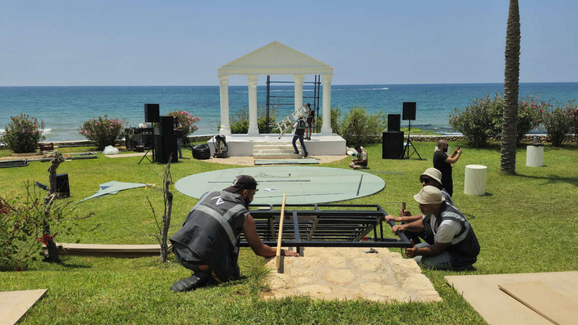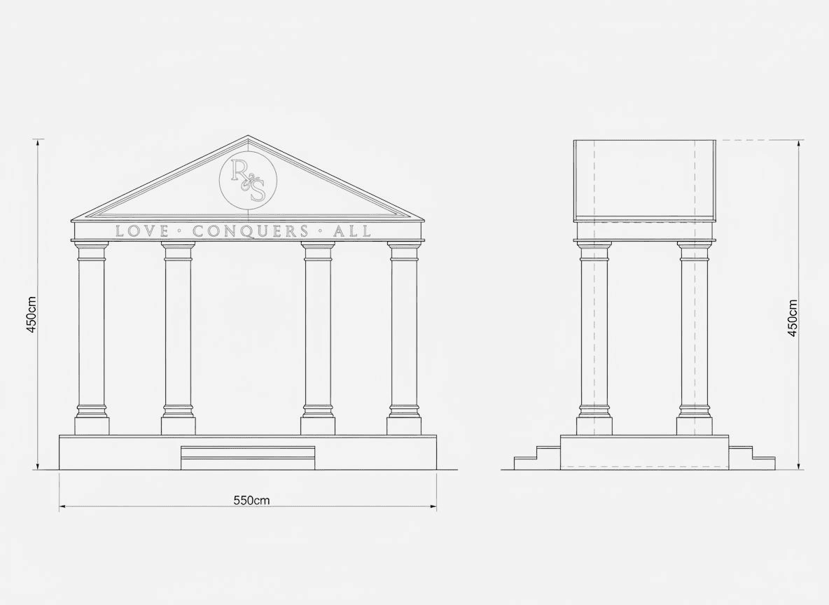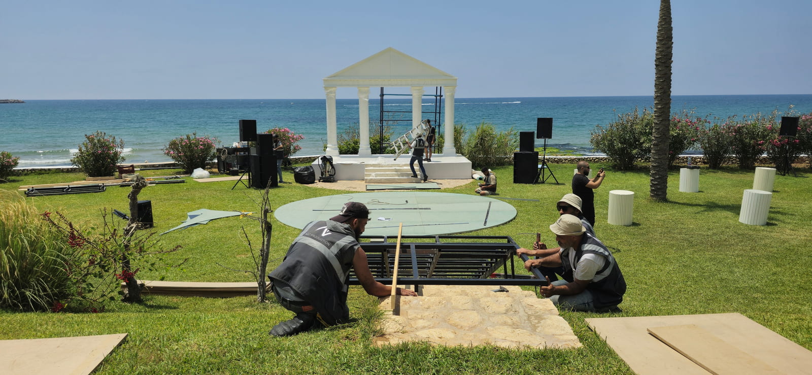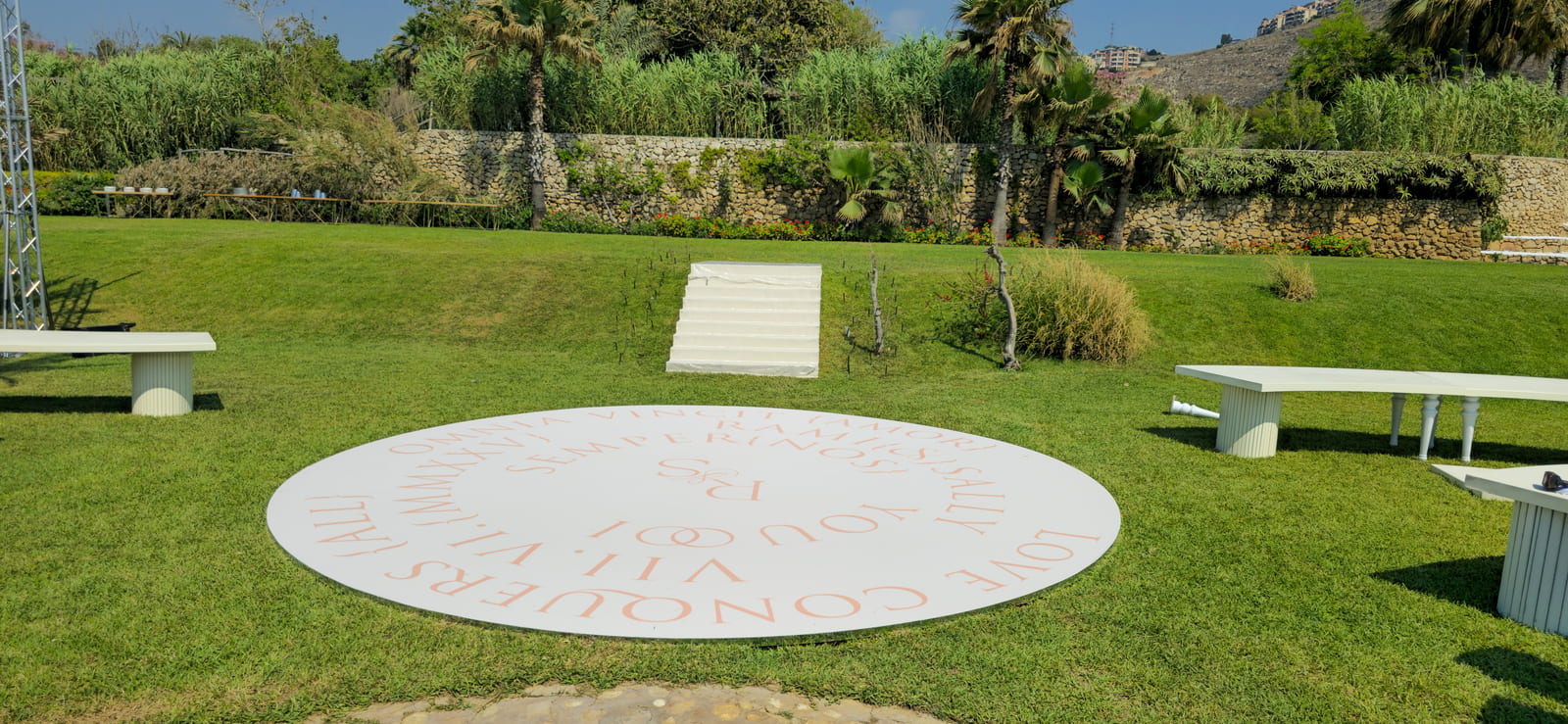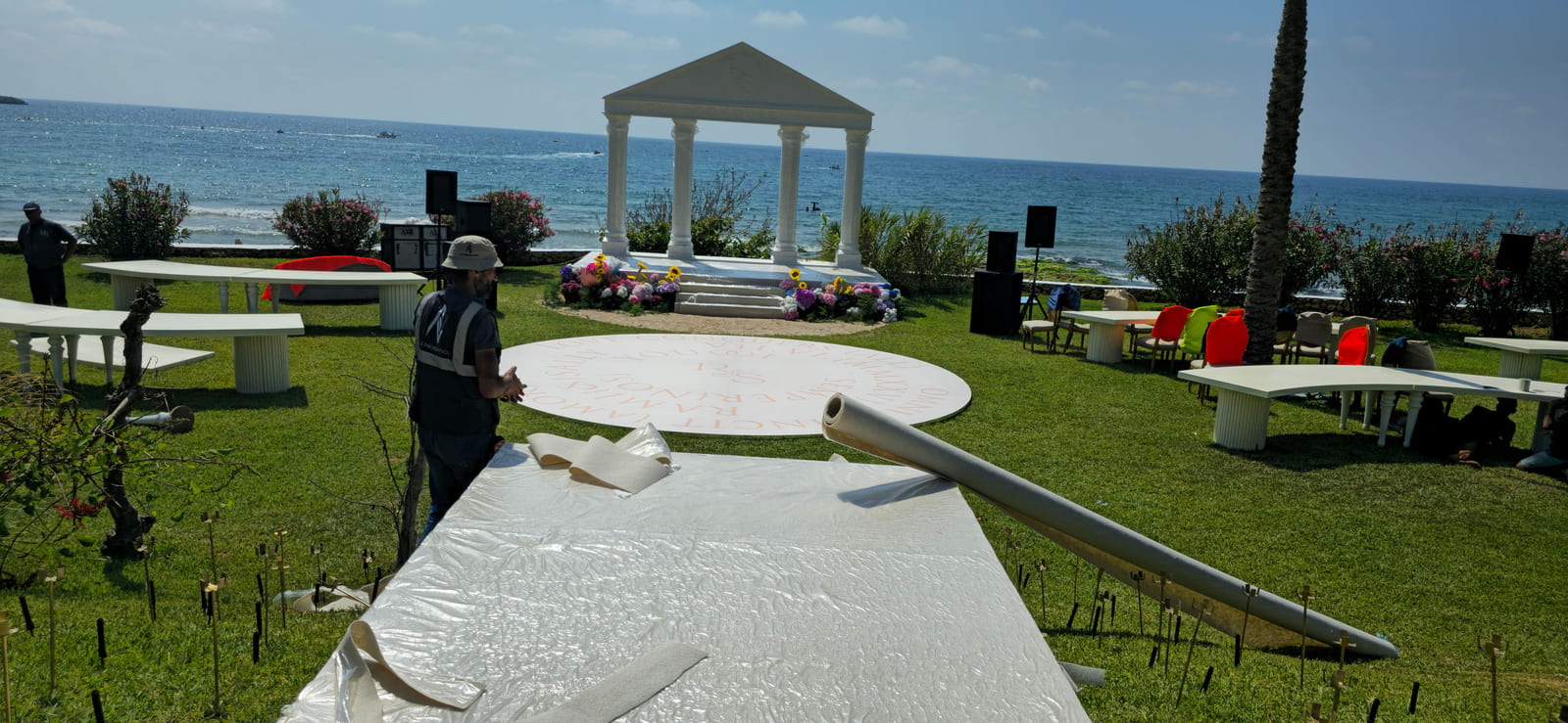 The setup features a greek-style wooden structure with columns and a pediment, painted white for a classical look. The stage is carpeted in white, while the dancefloor is wood covered with a printed design featuring elegant lettering. Colorful floral arrangements surround the base, adding vibrancy, and sound equipment is neatly integrated for a polished, professional finish.