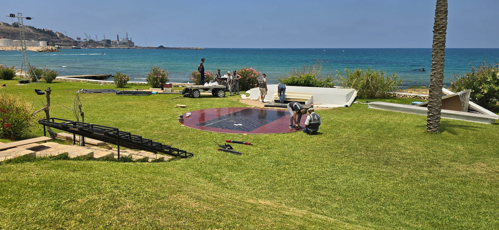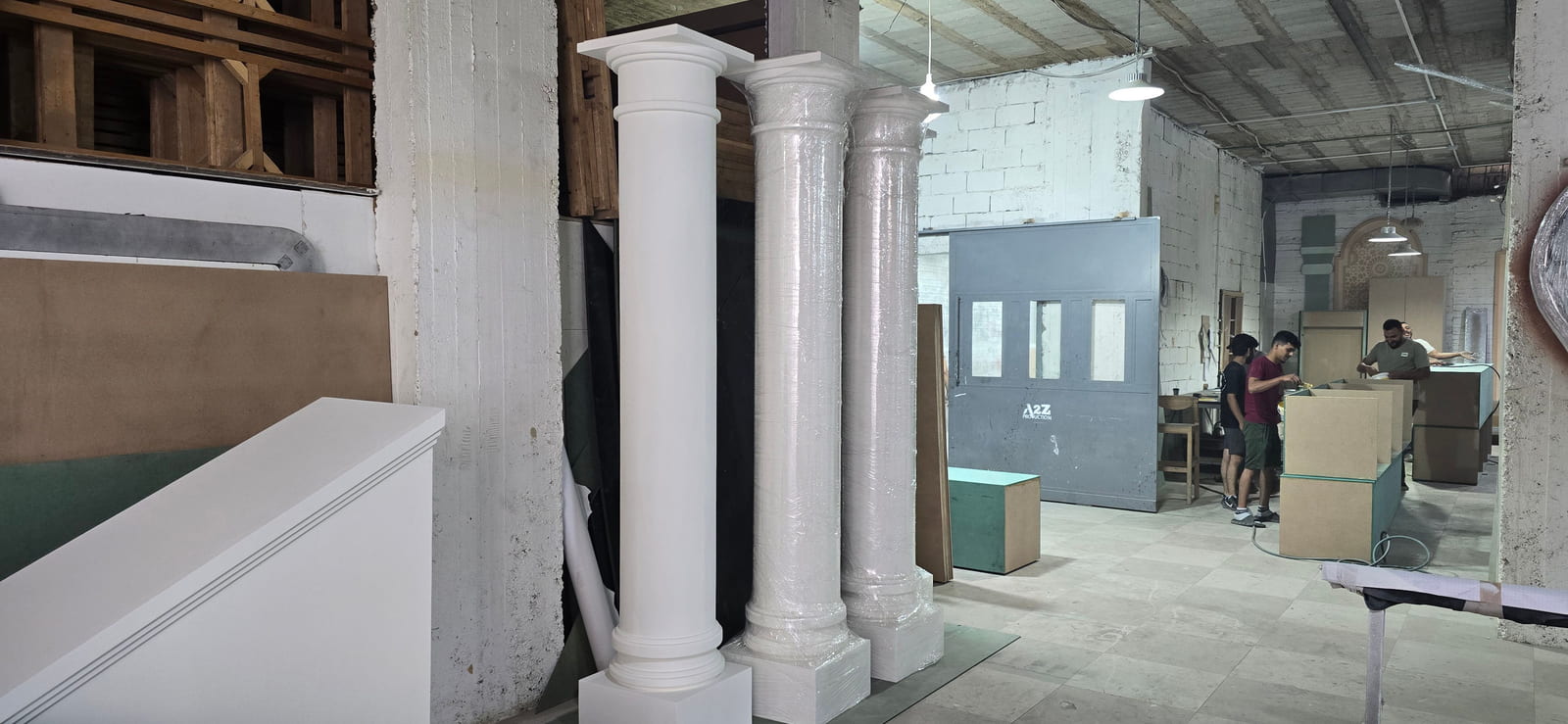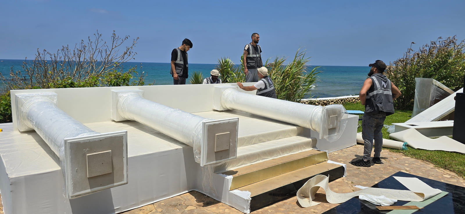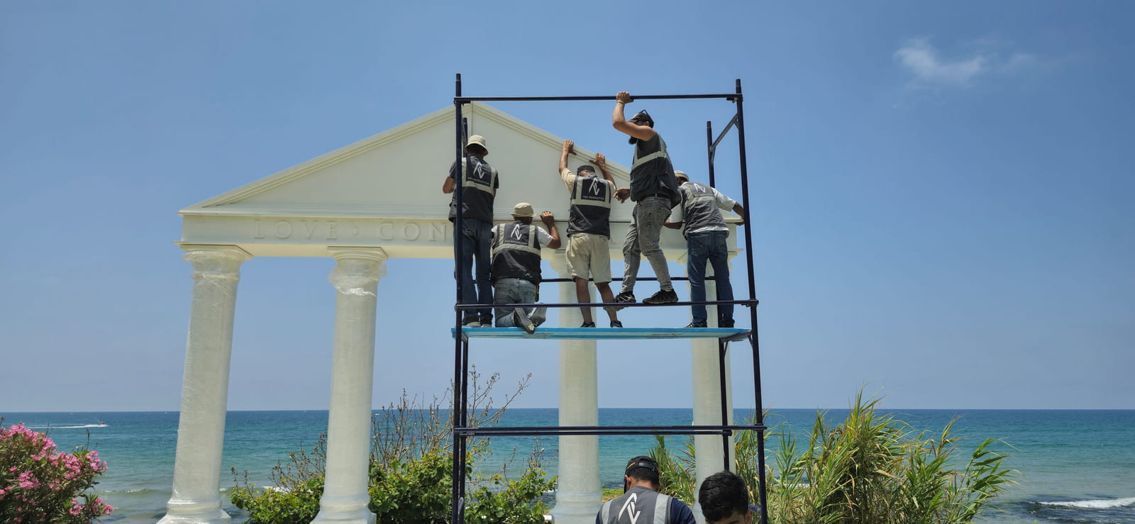 The setup features a greek-style wooden structure with columns and a pediment, painted white for a classical look. The stage is carpeted in white, while the dancefloor is wood covered with a printed design featuring elegant lettering. Colorful floral arrangements surround the base, adding vibrancy, and sound equipment is neatly integrated for a polished, professional finish.