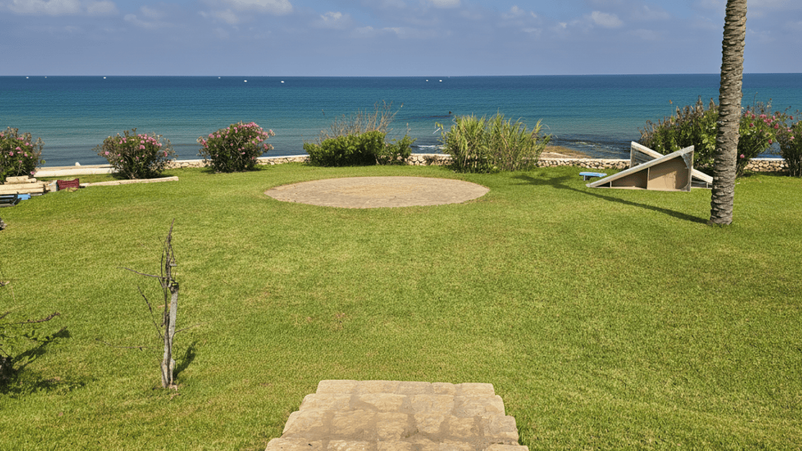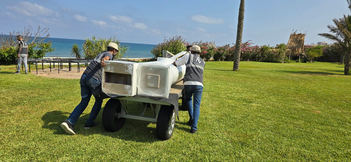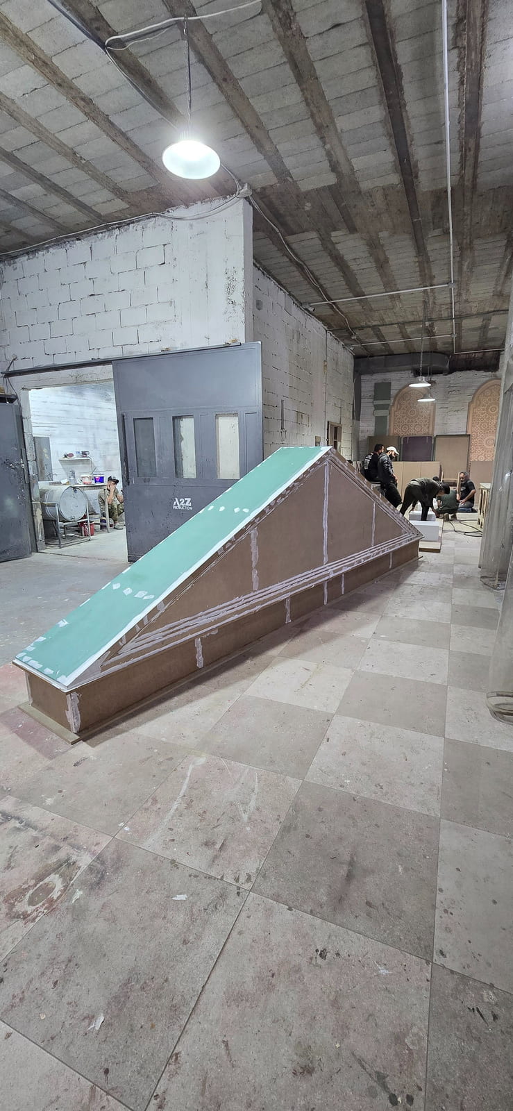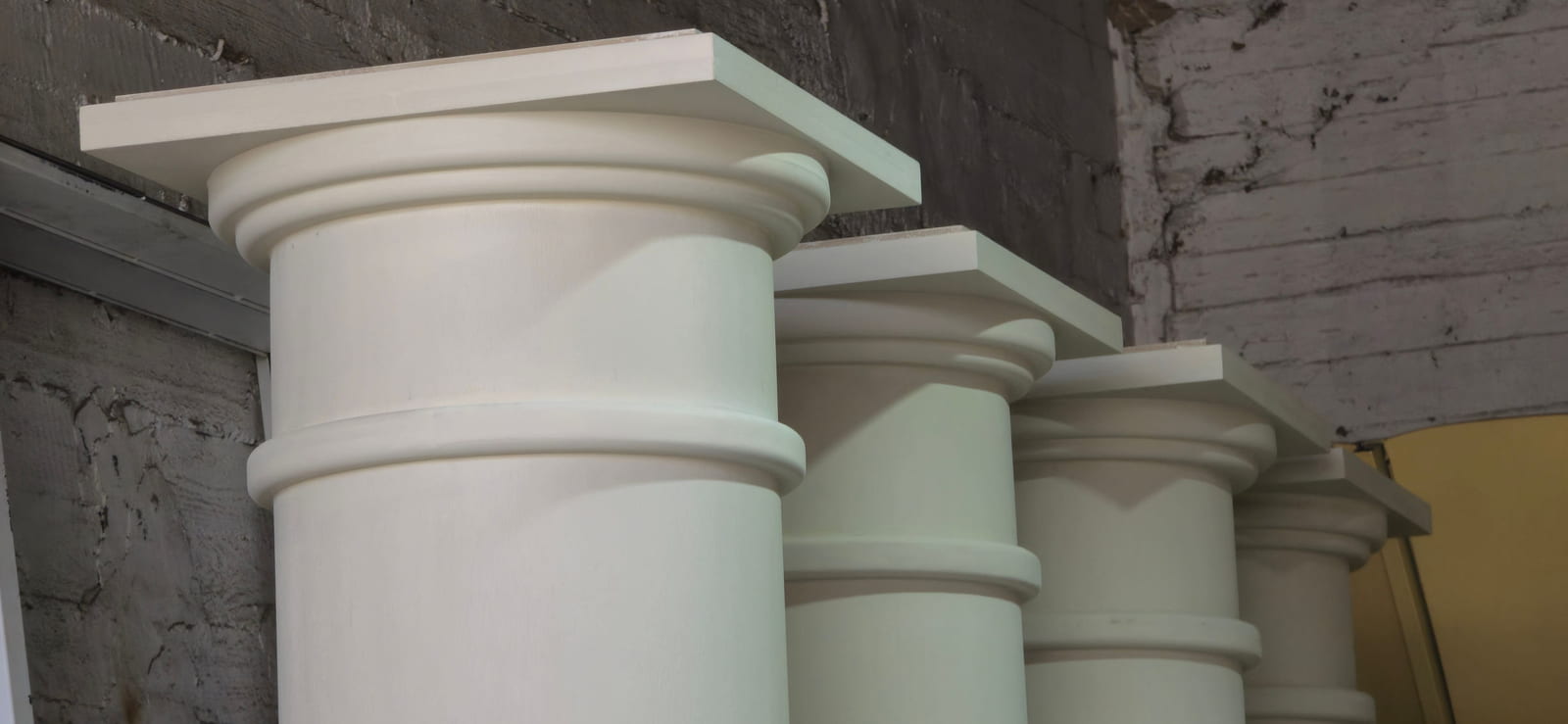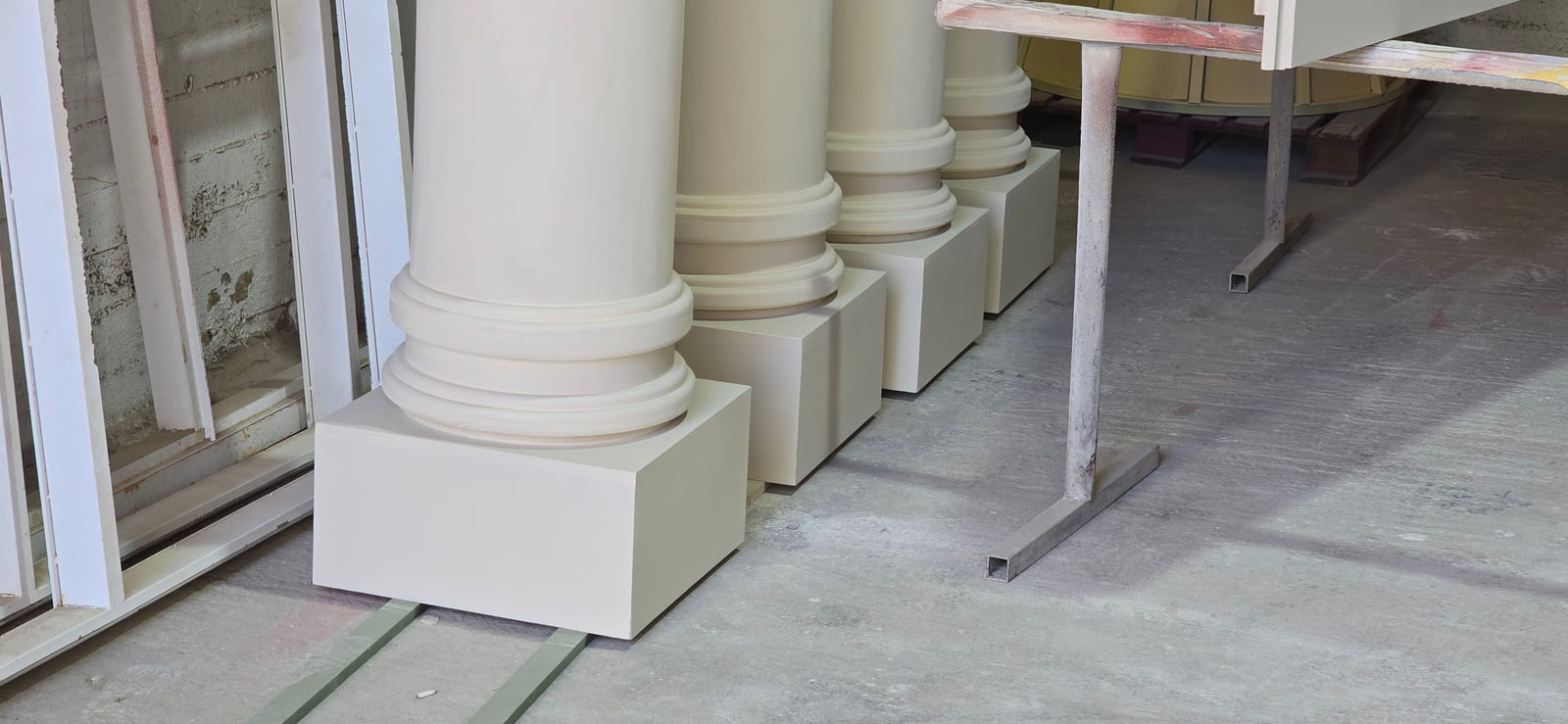 The setup features a greek-style wooden structure with columns and a pediment, painted white for a classical look. The stage is carpeted in white, while the dancefloor is wood covered with a printed design featuring elegant lettering. Colorful floral arrangements surround the base, adding vibrancy, and sound equipment is neatly integrated for a polished, professional finish.